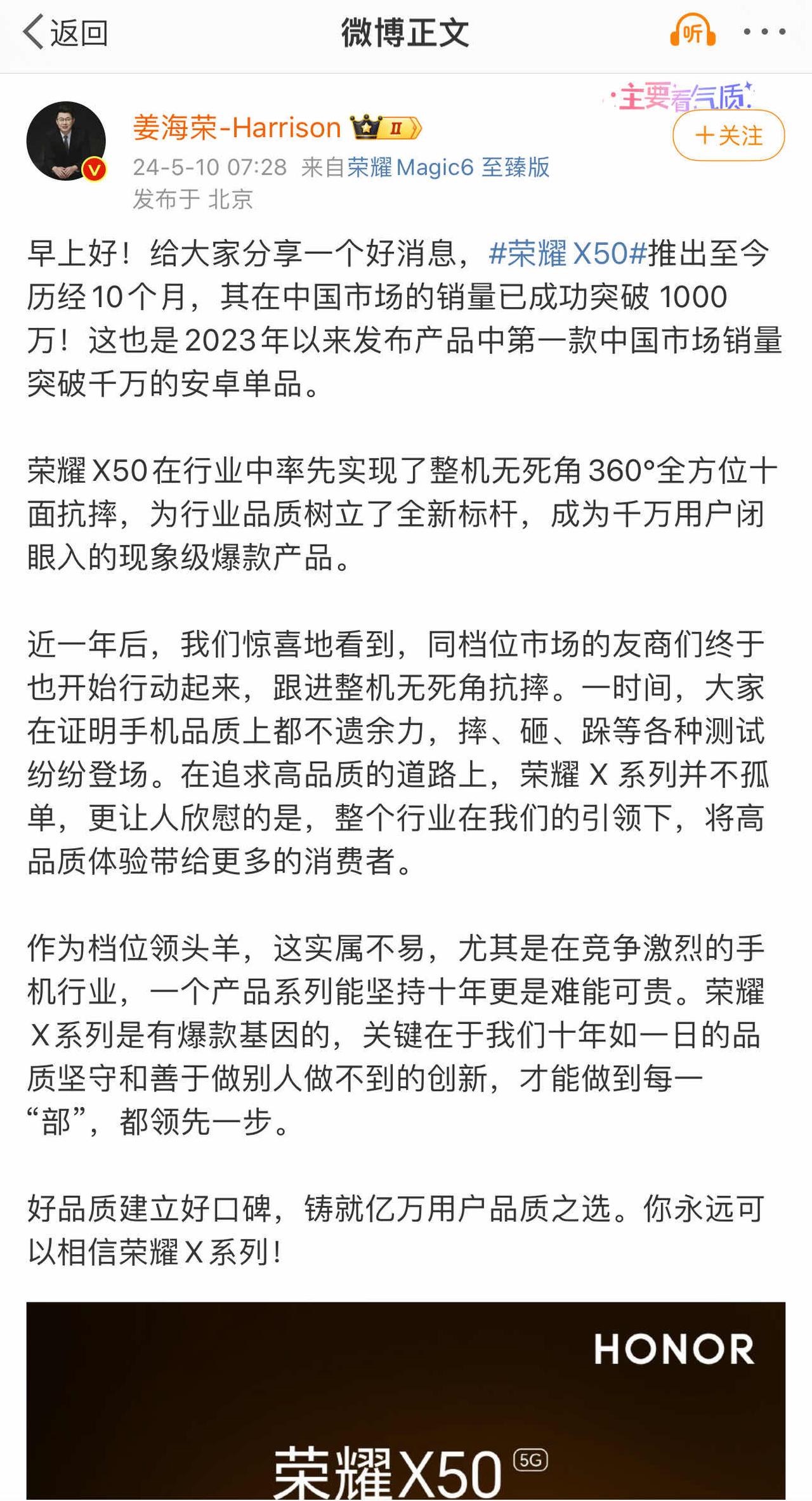从去年2023年到现在,最火的机型不是iPhone 15,也不是遥遥领先,而是荣耀的一款机型X50。 姜海荣发的这条微博信息量有点大,我带大家解读一下。 1,荣耀X50现在的销量已经过了千万台,是2023年到现在唯一一个安卓千万爆款手机,没有之一。 2,千万台的销量是什么概念呢?大致相当于每3秒一台,当你看这条内容的时候,手机已经迈出好几步了。 3,荣耀X50之所以这么受认可,还是因为核心产品力有诚意,无论是外观,还是性能屏幕拍照等等都做到了均衡水准。而且360度全面抗摔产品力引得众多厂商模仿,模仿就是最好的认可。 现在第三方电商平台评价数量100W+,好评率高达97%,这才是真正的国民好手机。#荣耀X50每3秒卖出一台#