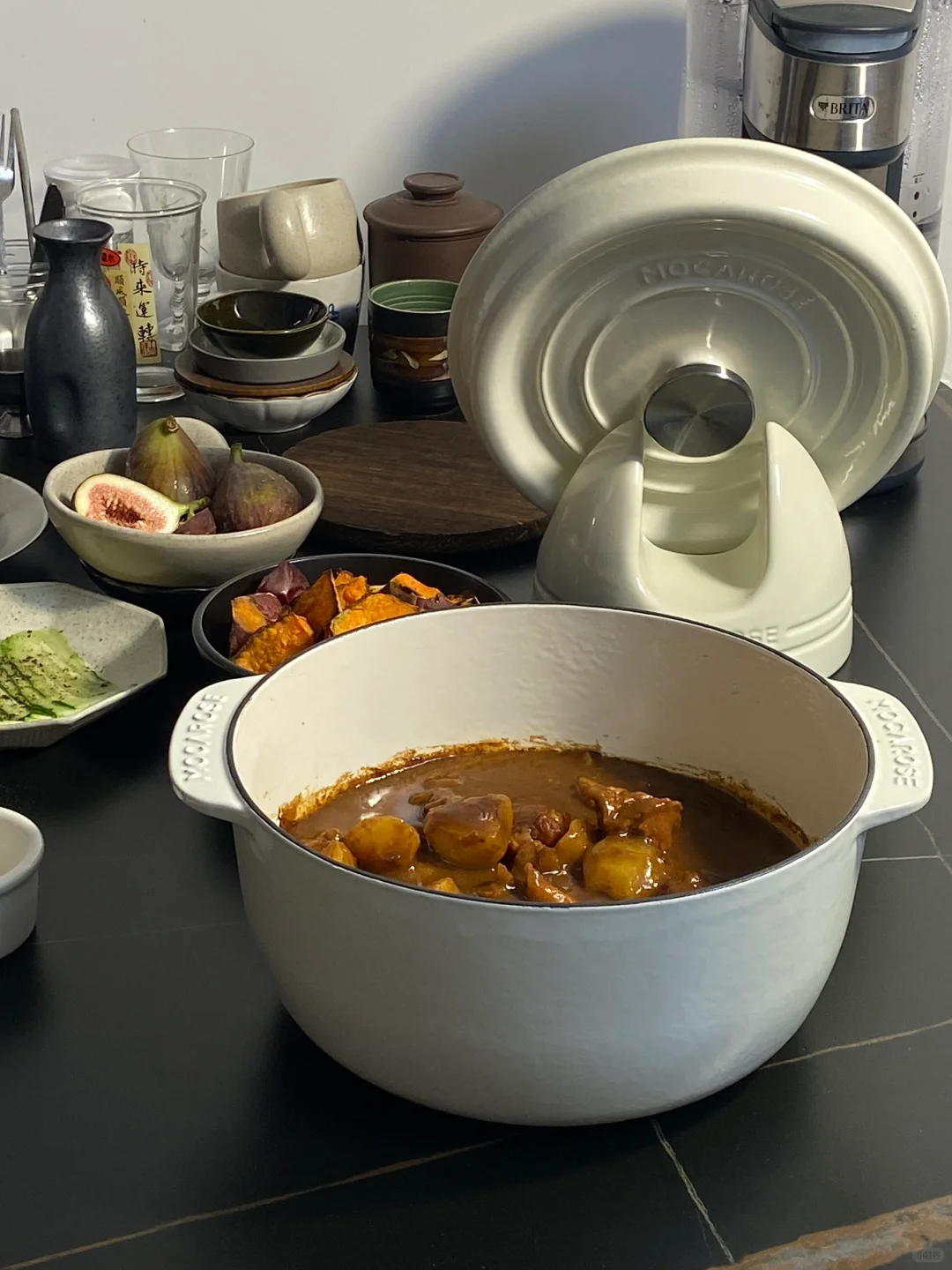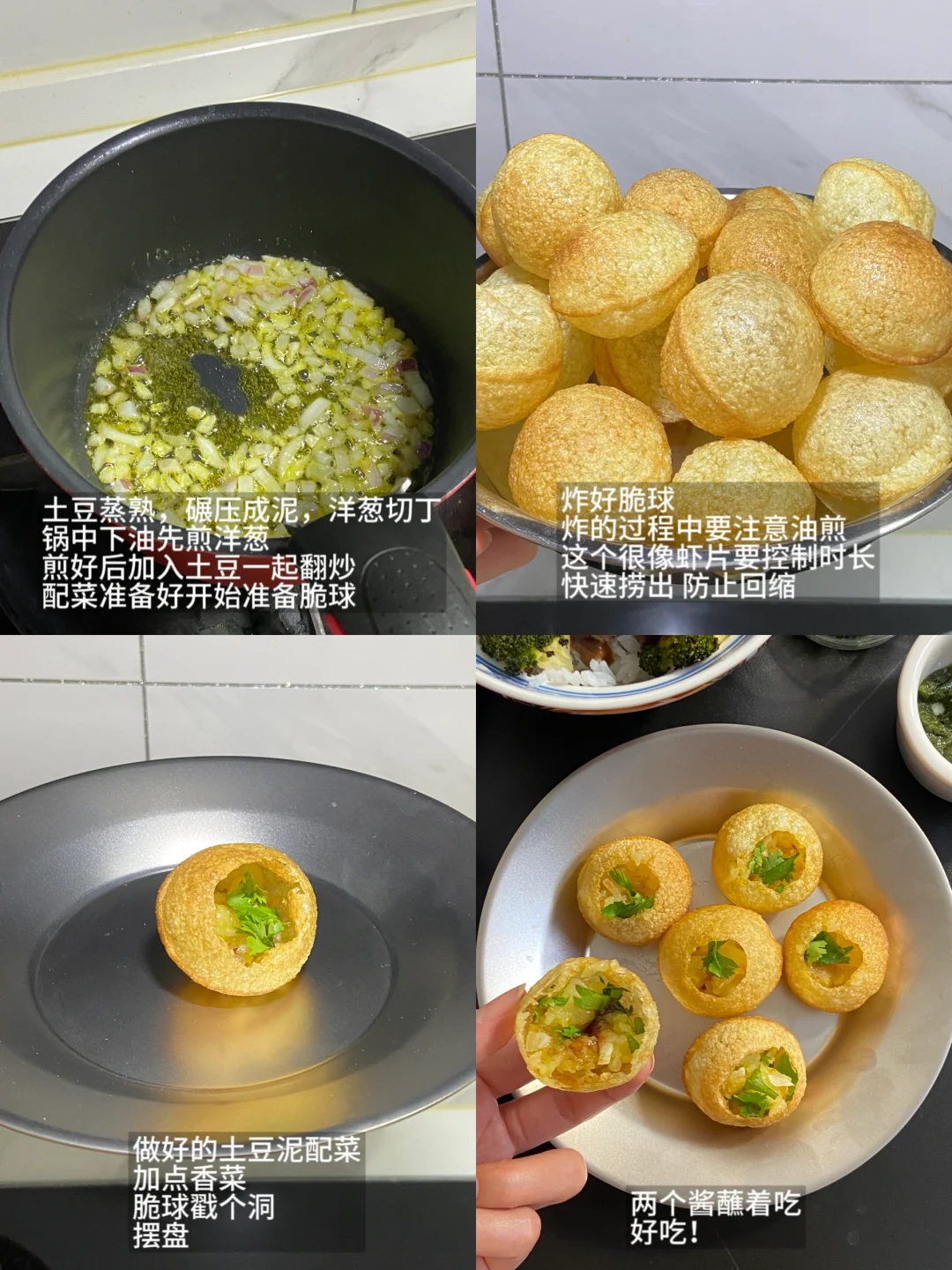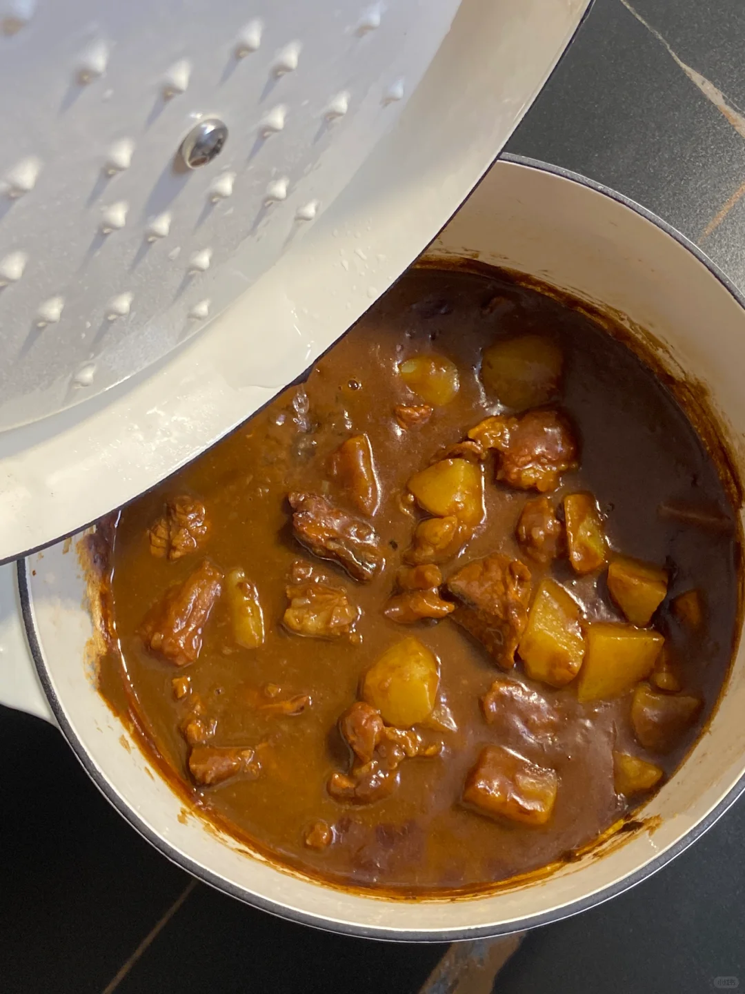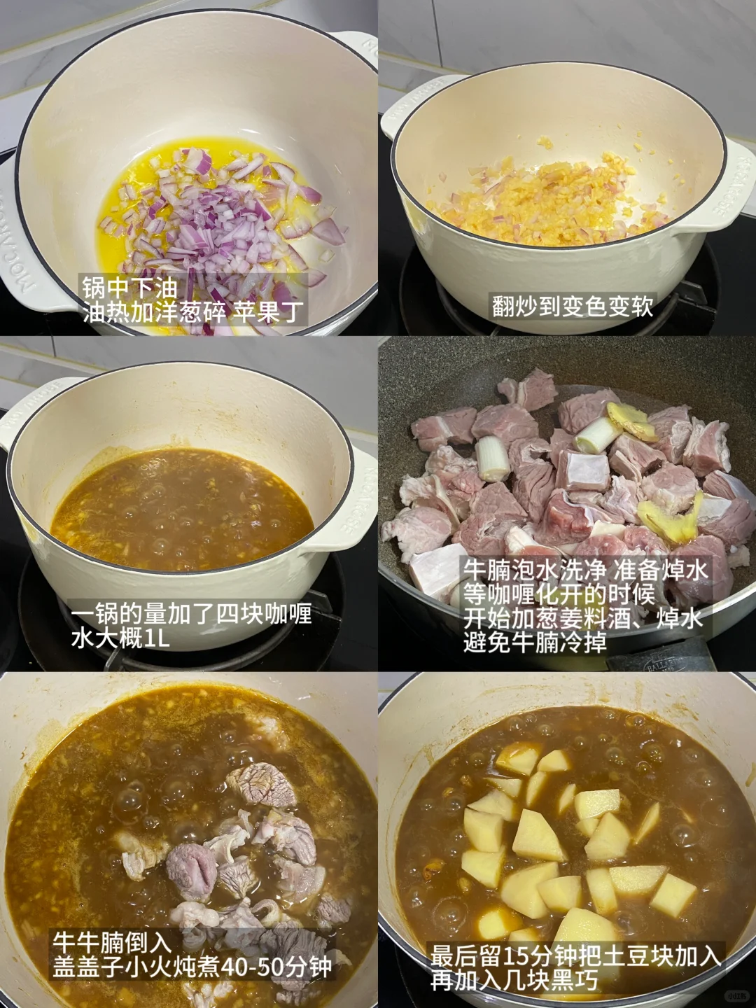 ——————【咖喱牛肉饭】—————— 食材: 牛腩一斤大概|咖喱块|洋葱1/2|苹果1个|黑巧克力 步骤: 1)牛腩提前泡水,泡完焯水加料酒葱姜,泡完后等待备用 2)苹果、洋葱切碎,能打成泥最好,没有工具就切成碎,锅中下油,先把苹果和洋葱一起倒入,翻炒到变软变色 3)加入四个咖喱块,倒入开水煮到融化,同时牛腩开始焯水 4)基本上咖喱煮化,牛腩也焯好了,不要再过冷水,直接加入牛腩,搅拌均匀盖盖子小火炖煮50分钟 5)中途准备土豆块,等最后十五分钟再加进去,煮的过程中开盖一次加水,防止汤汁煮得太干,加两块黑巧,颜色会变得更好看,也不会影响口感 6)烤了一点西兰花和地瓜,一起搭着时蔬吃 ——————【玛莎拉脆球】—————— 食材: 脆球|土豆|洋葱|香菜 步骤: 1)土豆蒸熟,碾压成泥,洋葱切丁,锅中下油先煎洋葱,煎好后加入土豆一起翻炒,配菜准备好开始准备脆球 2)炸的时候速度很快,要快速捞出定型,配上两个酱,绿的是辣的,兑水蘸着吃,红酱是酸甜的 3)脆球戳个洞,把土豆泥、香菜加到脆球里,浇汁开吃(完全不邪恶!很好吃) 家用炖菜,珐琅锅可算是很重要了,我用的这个白色的24cm,大小刚好够一家人的食量,整个锅体很厚实,炖的过程中锁水效果不错,激出肉香的原汁原味,肉质也很软烂,珐琅锅炖肉必备