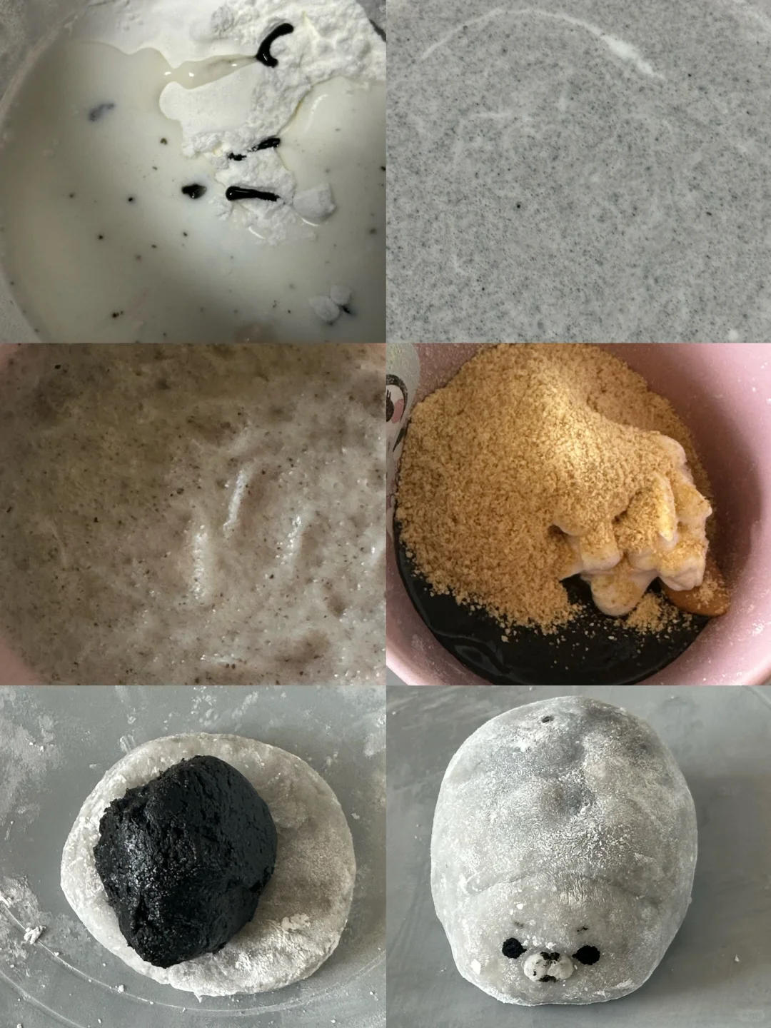 哈哈哈哈哈太可爱咯 配料: 饼皮:45g低粉、23g蛋液、65g牛奶、15g糖、2g泡打粉 糯米糍皮:20g糯米粉、5g玉米淀粉、33g水、黑芝麻酱 黑芝麻馅:22g黑芝麻酱、10g熟黄豆粉、10g蜂蜜、20g椰浆(或牛奶)、5g花生酱 其他:豆沙、黑色色素、熟粉 1.糯米糍皮配料混合均匀微波炉打1分钟 2.馅料配料混合均匀,糯米皮包裹(熟粉防粘),装饰上表情备用 3.饼皮配料混合均匀,在不粘锅抹少量油,小火煎至表面起泡翻面 4.煎好的饼皮抹上豆沙,夹入小海豹