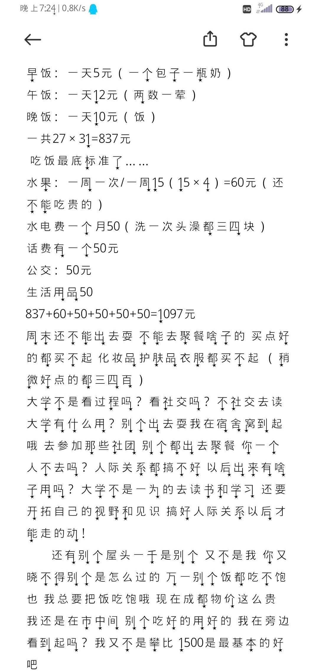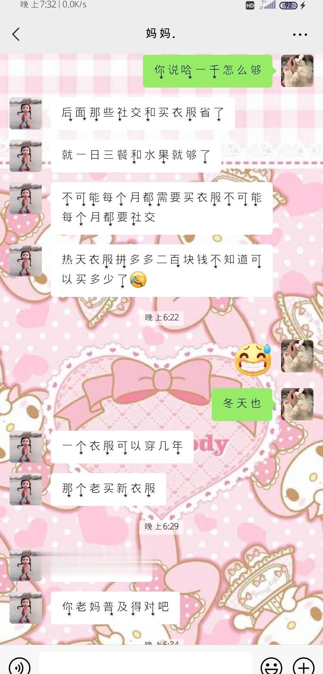 怎样才能说服我妈每个月给我1500,作为大学的生活费1500真的不够她还说,我不需要应酬,也不需要买衣服我好烦我好烦图3是我现在发给她的她还没回复我住在成都三环路,房价很高(我家不穷,至少我们每个月能负担得起1500)