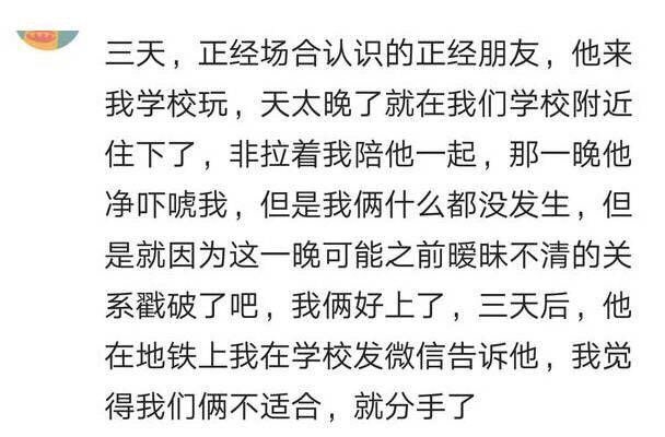 15年的一个吧,家里亲戚介绍的,比我大三岁,88年的。有一搭没一搭的聊了几天,约见面,请她吃的烧烤。一周后,见第二面,吃的炒菜。饭后去散步,聊了一个多小时,她请我看了电影。然后当天晚上就把该做的都做了,三次,还没带安全措施。第二天一早,一起吃个早点,饭后带她去药店买了事后药,路边超市买瓶矿泉水就着吃过药,她说昨天没睡好,回家补觉去。给她送回家就分开了。当天晚上,她给我发微信说感觉有点不合适,还是做朋友吧。
