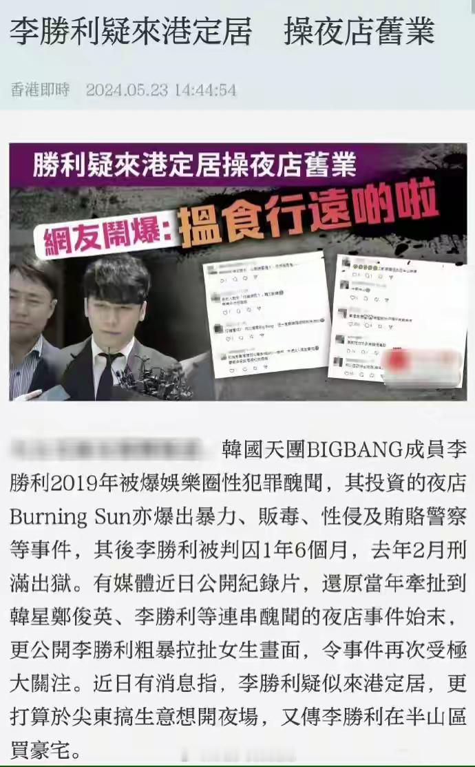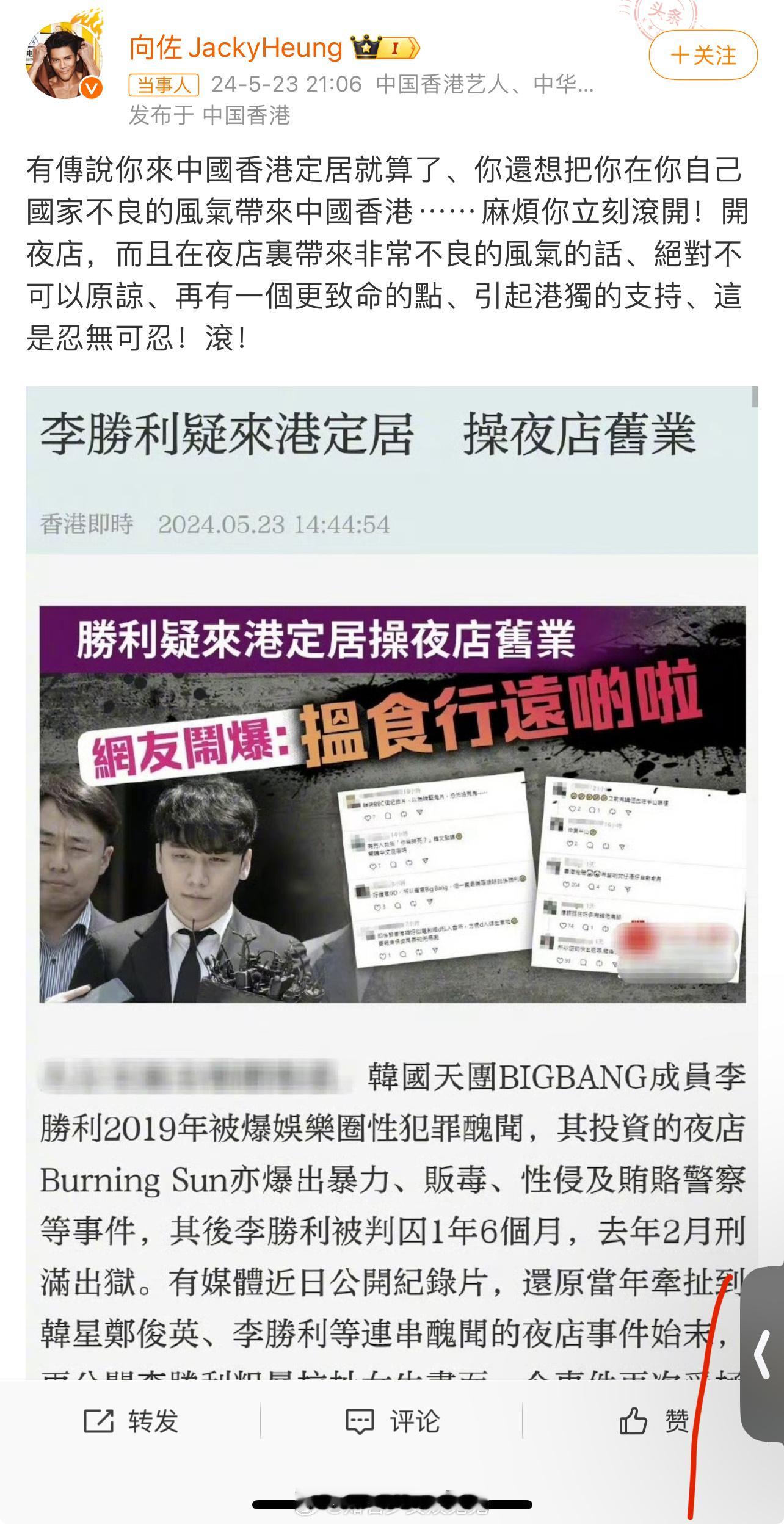 李胜利疑要在香港开夜店,向佐评论香港不欢迎他,让李胜利离中国香港远一点!获网友力挺!港媒报道李胜利疑似打算在香港定居,更打算在尖东开夜店,又传他在半山区买豪宅。李胜利在韩国已经臭名昭著,所以无法混下去,他可能真的想在香港重操旧业。