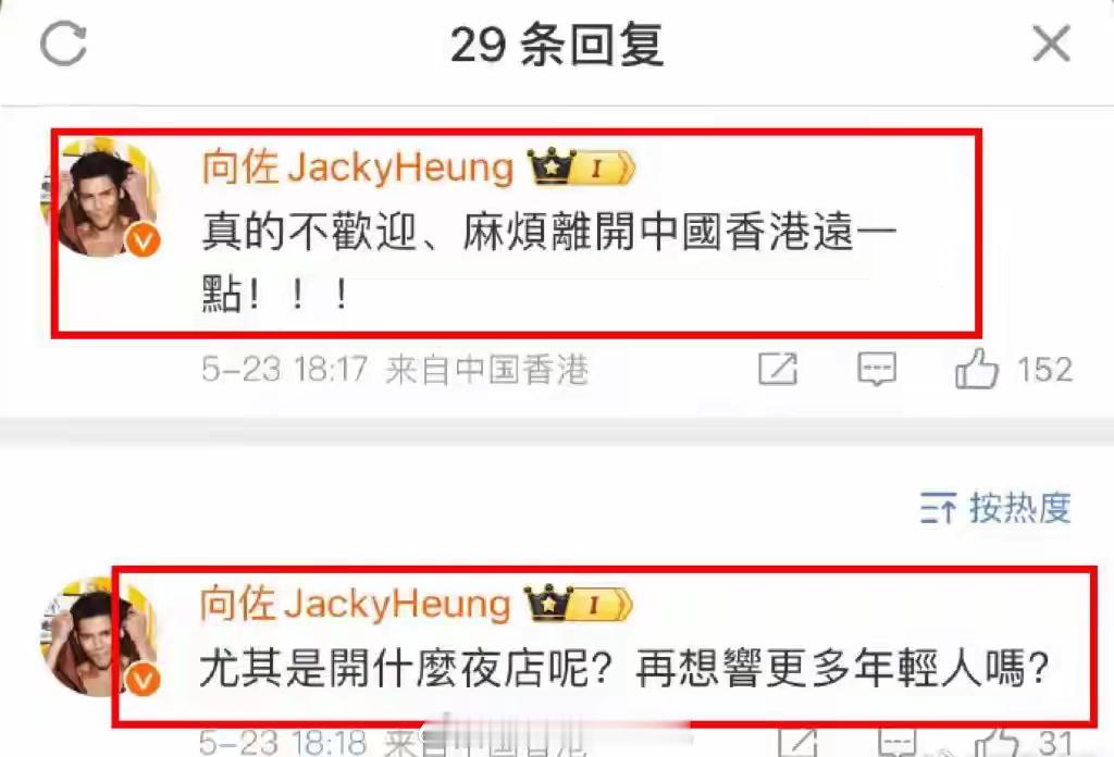 香港演员向佐听到这个消息,留言表示,真的不欢迎,麻烦离开中国香港远一点。尤其开什么夜店,再影响更多年轻人吗?