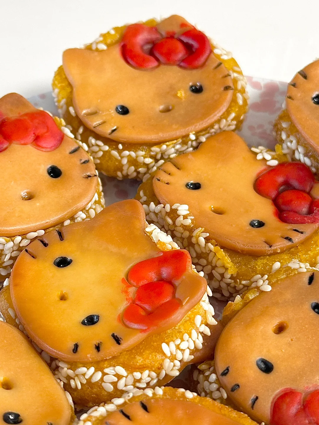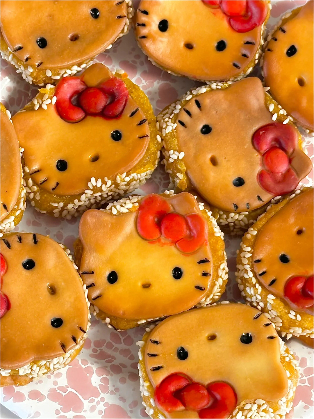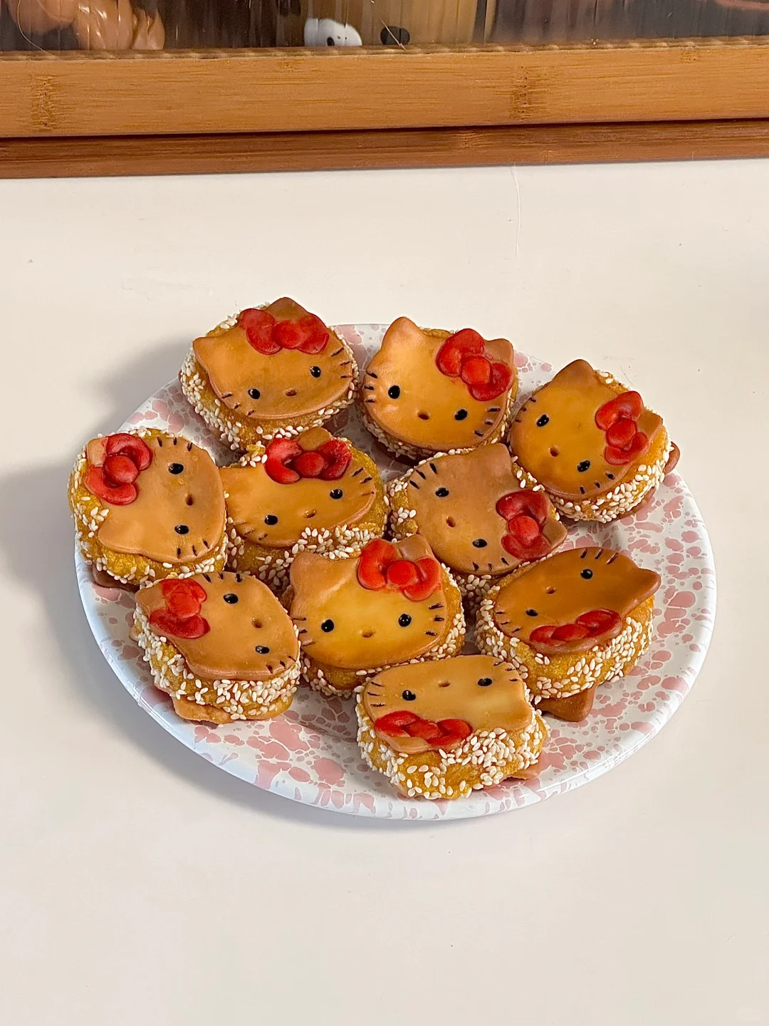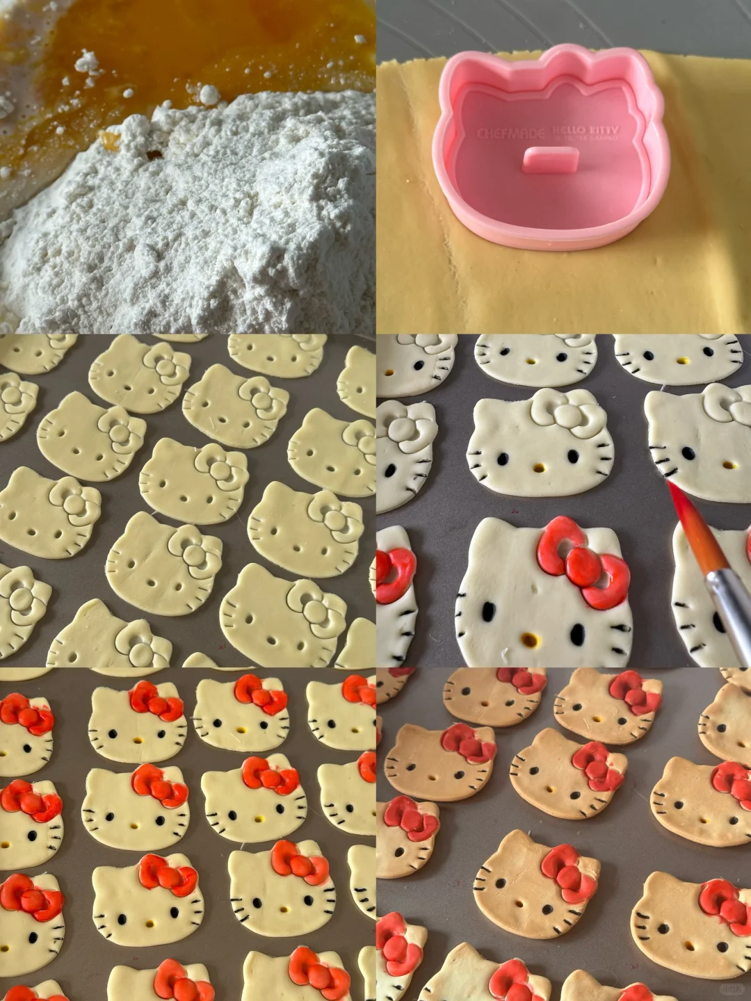 1.饼干配料混合均匀,揉光滑,盖保鲜膜松弛一会,擀扁,模具压出kitty头,色素画上颜色