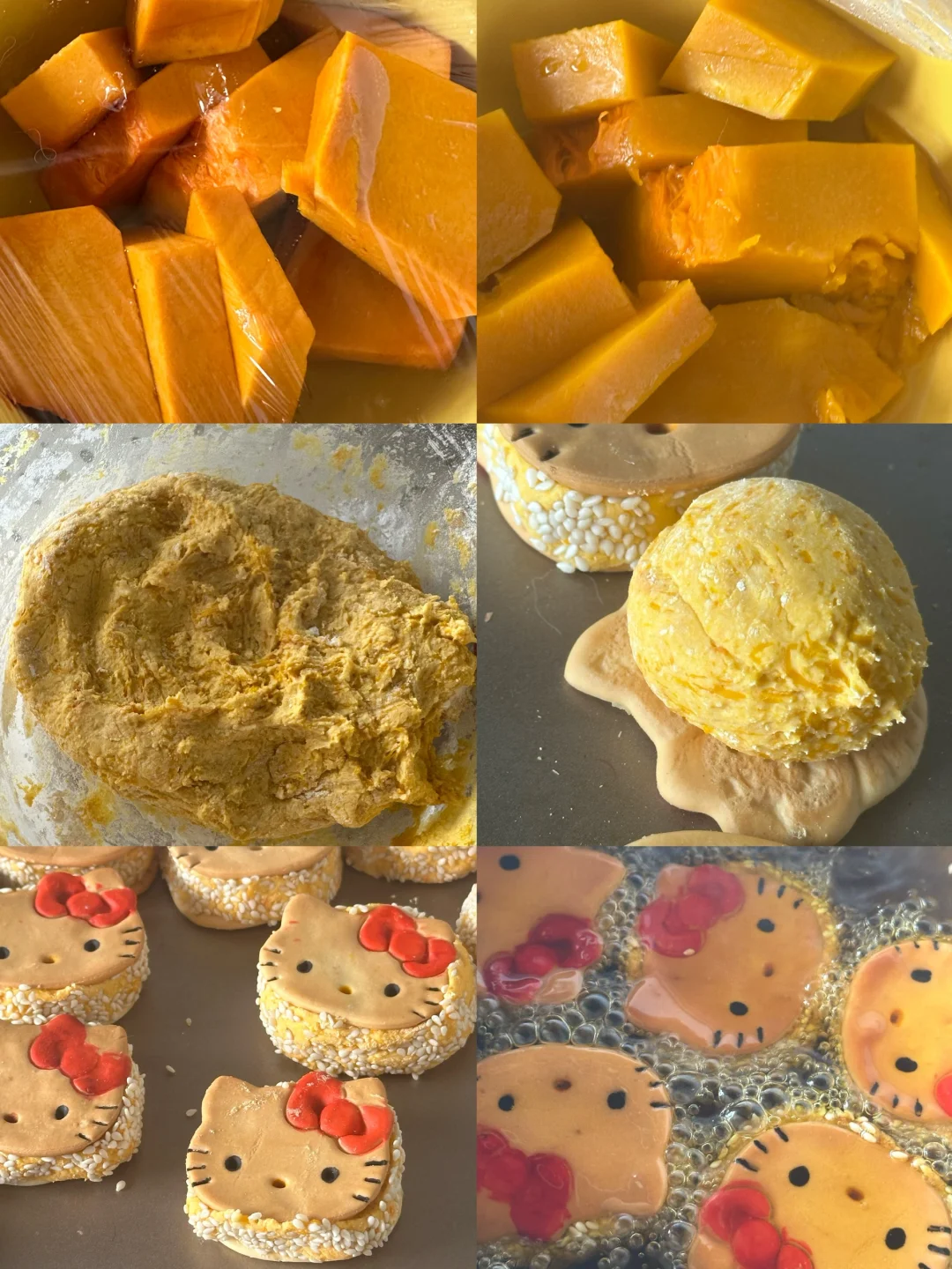 4.熟南瓜少量多次加入糯米粉直到可以揉成团