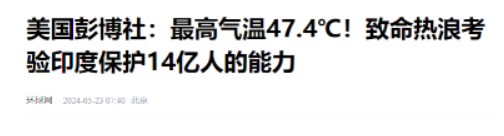 参考信源:环球网2024年5月20日——《美国彭博社:最高气温47.4℃!致命热浪考验印度保护14亿人的能力》