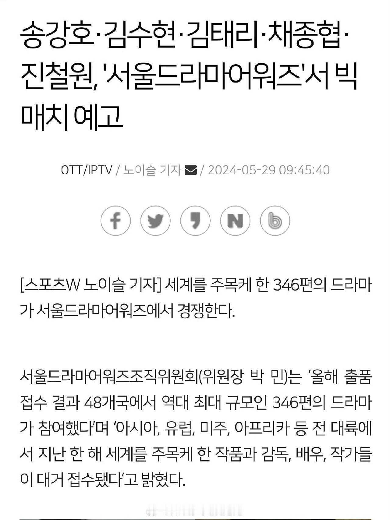 首尔电视剧大奖组织委员会表示:“今年的参展作品接收结果显示,来自48个国家的346部电视剧参与了此次评选,亚洲、欧洲、美洲、非洲等全大陆去年一年间备受世界瞩目的作品和导演、演员、作家大举入围”。
