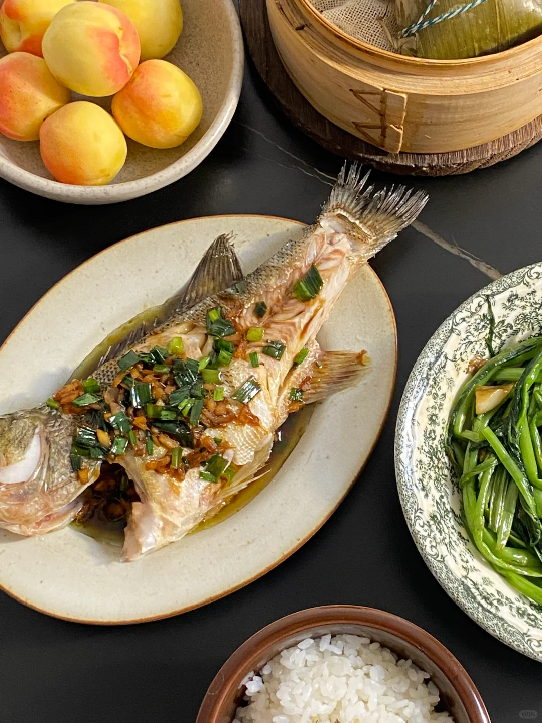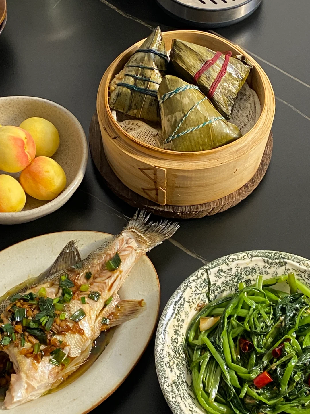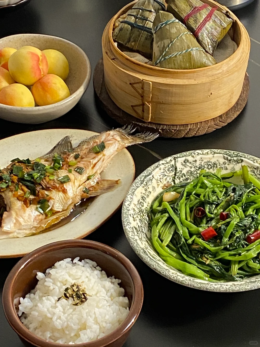 今日菜谱📜葱油鲈鱼清炒空心菜粽子🥢