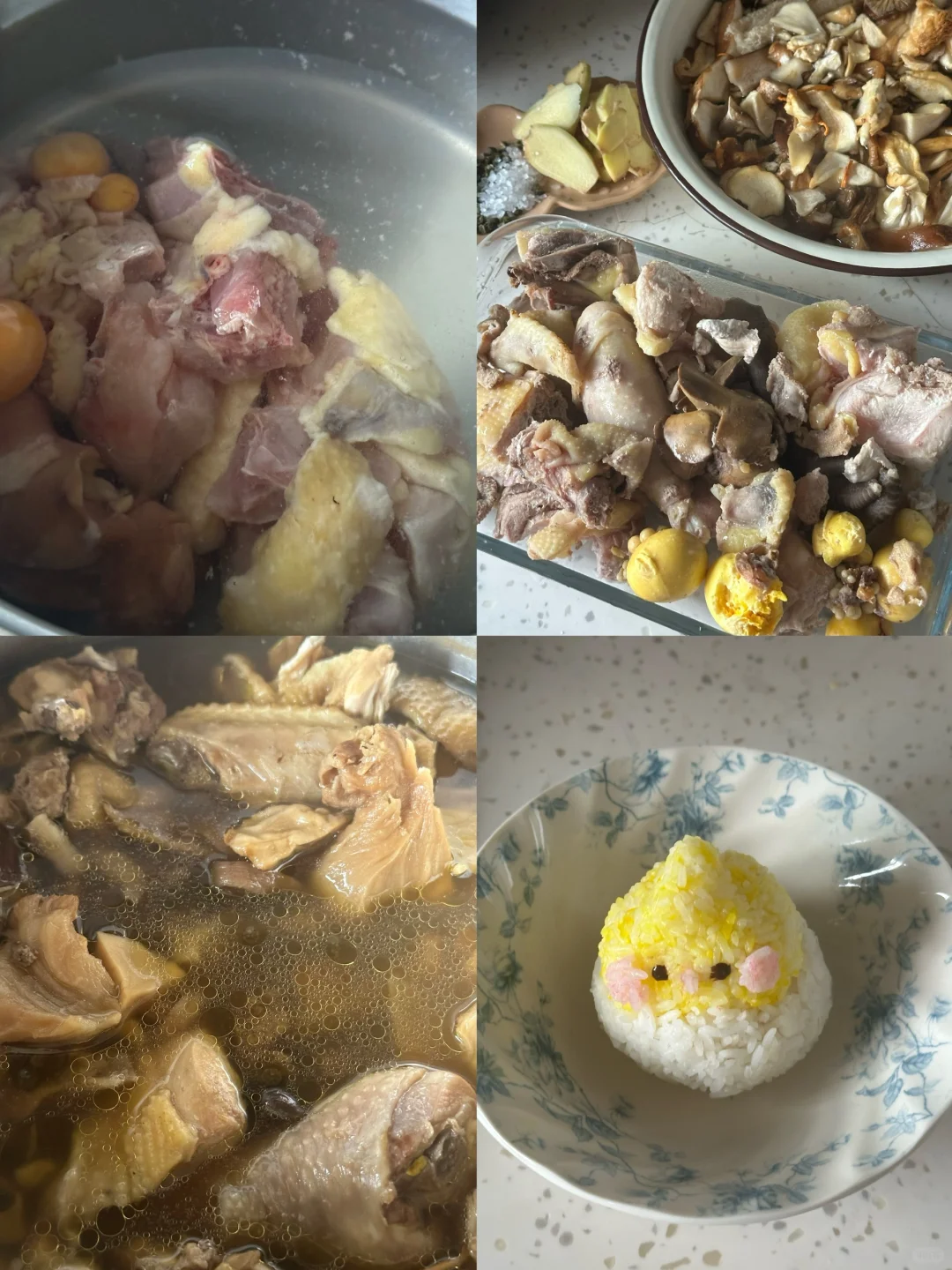 鸡汤:鸡肉、菌菇、盐、花椒、生姜
