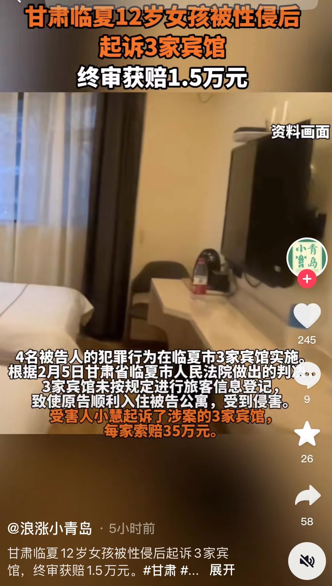 (来源:原文登载于新京报2024年5月30日关于《甘肃临夏12岁女孩被性侵后,起诉3家宾馆终审获赔1.5万元》的报道)