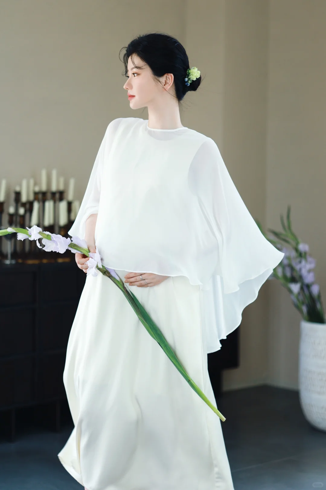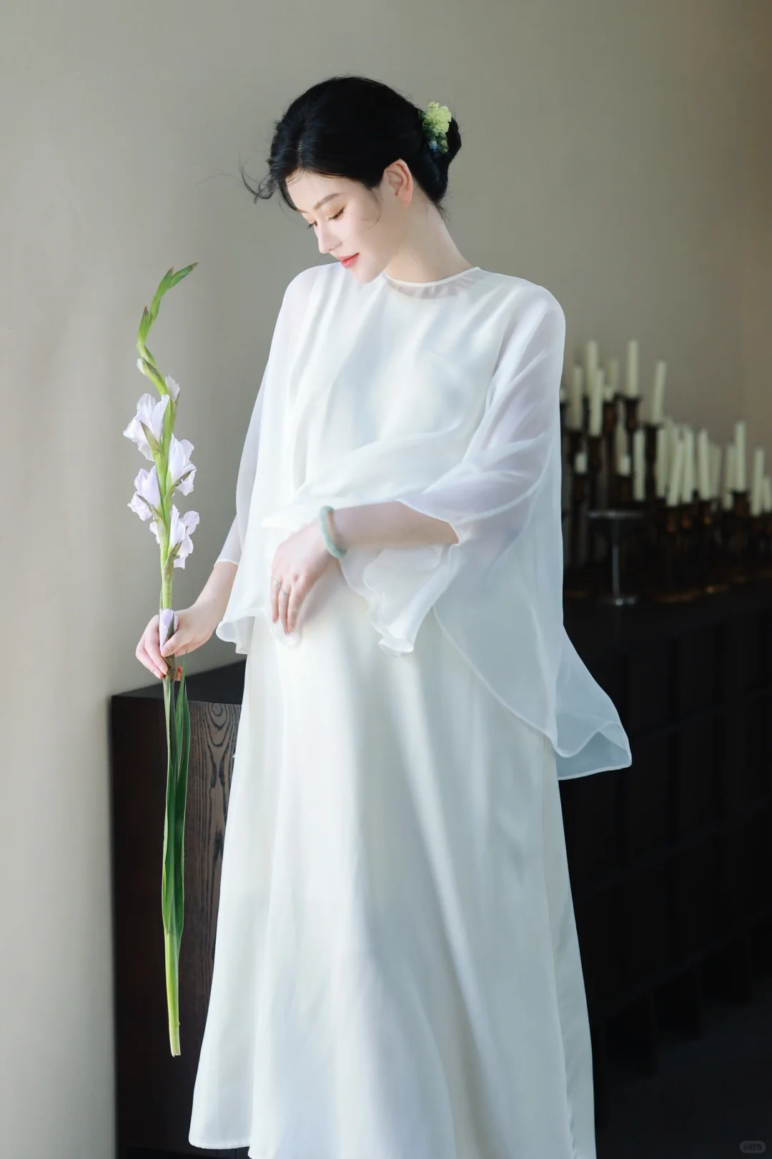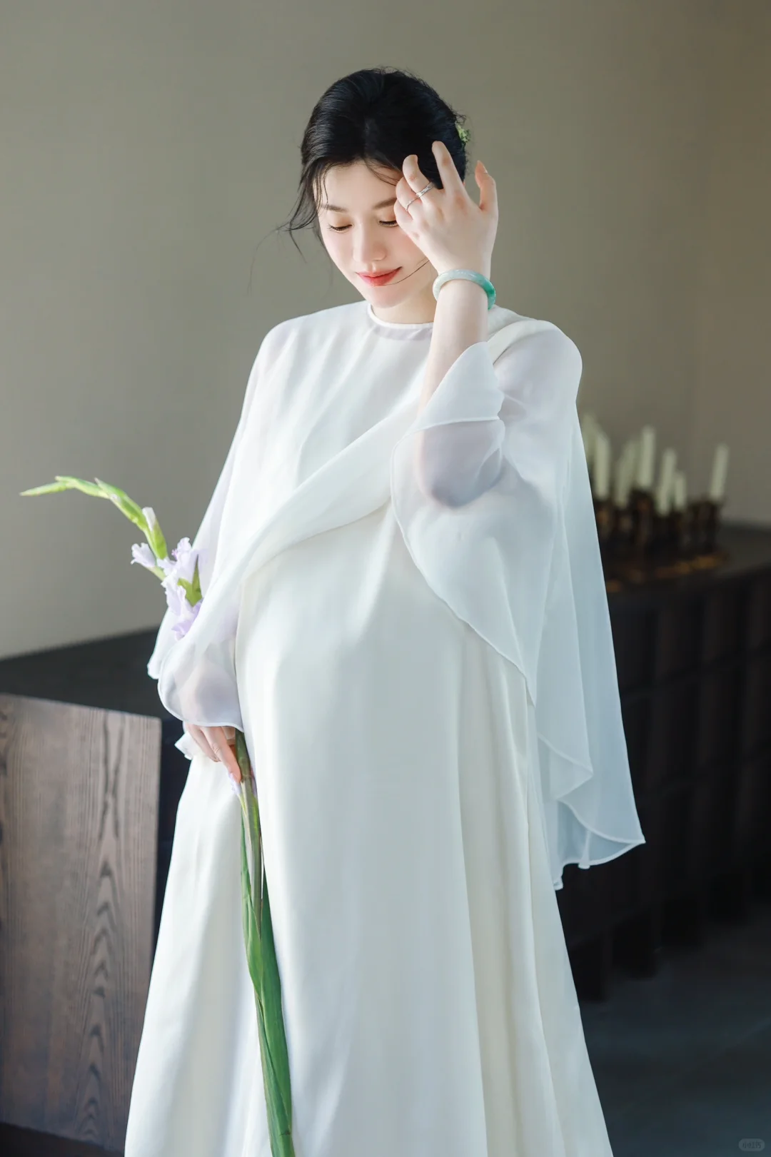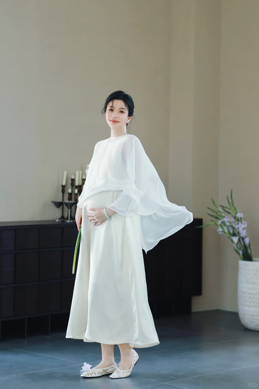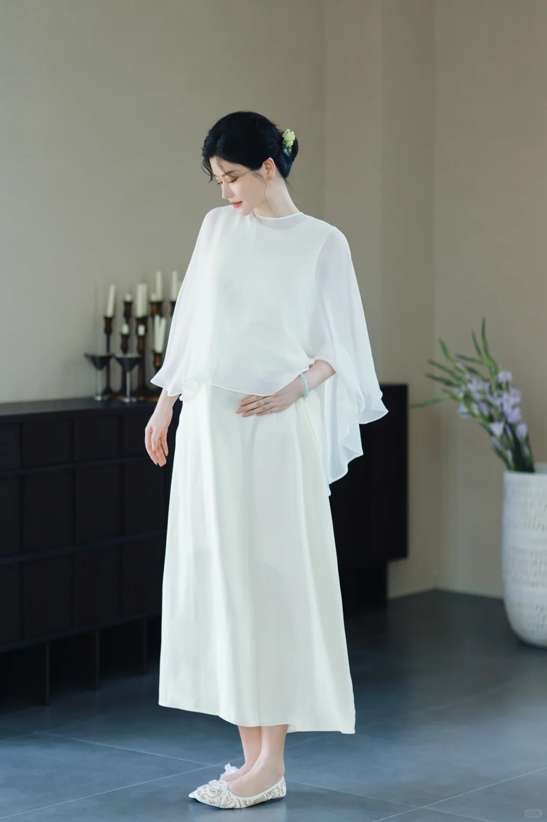 1️⃣如果不喜欢露肚子,可以在白色/米色长裙外穿一件朦胧的半透明真丝罩衫,再让风吹出孕肚的形状吧🫧超级出片[赞R]