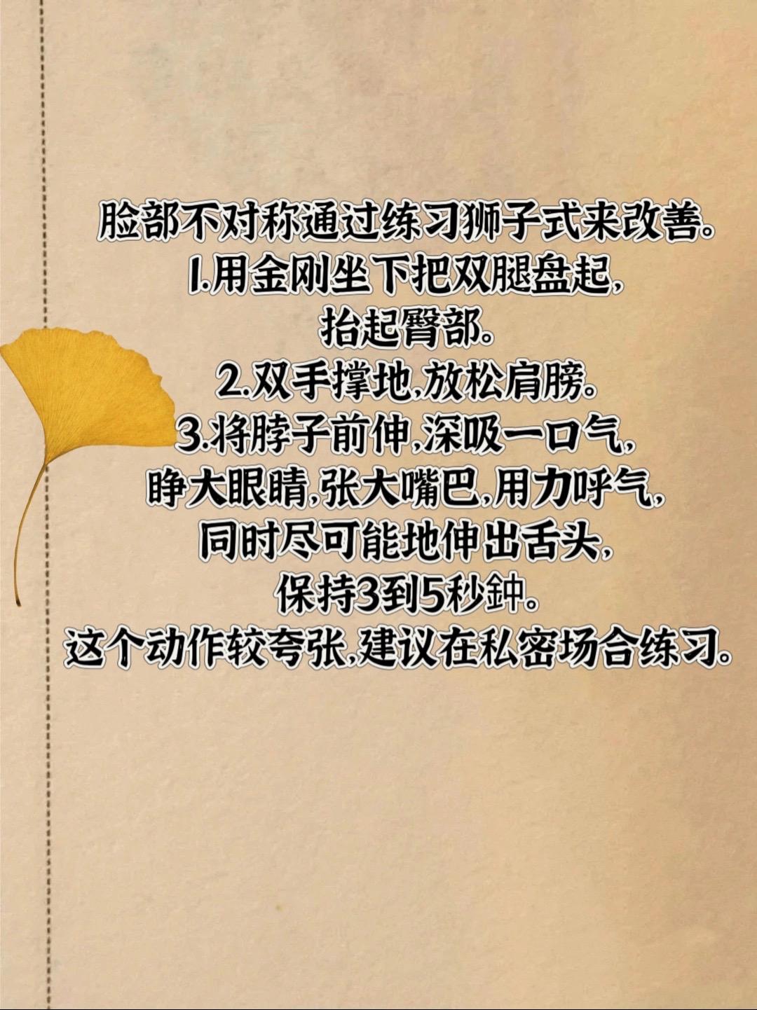 左右脸不对称改善。古人云:“相由心生”,我们的心态不仅影响着我们的内心世界,也会在一定程度上反映在我们的面孔上。在生活中,我们经常会发现,儒雅的人往往给人一种斯文的感觉。然而,有些人外表可能显得高冷,但实际上内心却充满温暖 脸部不对称可能会长皱纹,褶子 我们可以通过练习狮子式来改善。 1.用金刚坐下把双腿盘起,抬起臀部。 2.双手撑地,放松肩膀。 3.将脖子前伸,深吸一口气,睁大眼睛,张大嘴巴,用力呼气,同时尽可能地伸出舌头,保持3到5秒鈡。 这个动作较夸张,建议在私密场合练习。