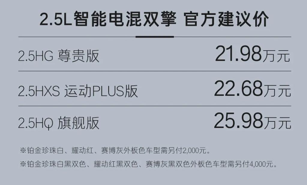【凯美瑞2.5L混动:21.98万起】第九代凯美瑞推出了搭载2.5L混动系统的车型,3款配置的售价为21.98-25.98万。目前在售的凯美瑞搭载2.0L混动以及2.0L自然吸气发动机。 这套2.5L混动系统的发动机最大功率为136kW,相比2.0L发动机高了24kW,最大扭矩为221N·m,比2.0L发动机高了33N·m。电机方面,其电机峰值功率为100kW,峰值扭矩为208N·m,相比2.0L版本的高了17kW和2N·m。整套系统的综合功率可以达到169kW,相比2.0L混动系统高了24kW。 传动系统,匹配的依旧是我们熟悉的E-CVT变速箱。官方公布的WLTC油耗为4.55L,作为参考,2.0L混动的油耗为4.5L【来自懂车帝车友圈】