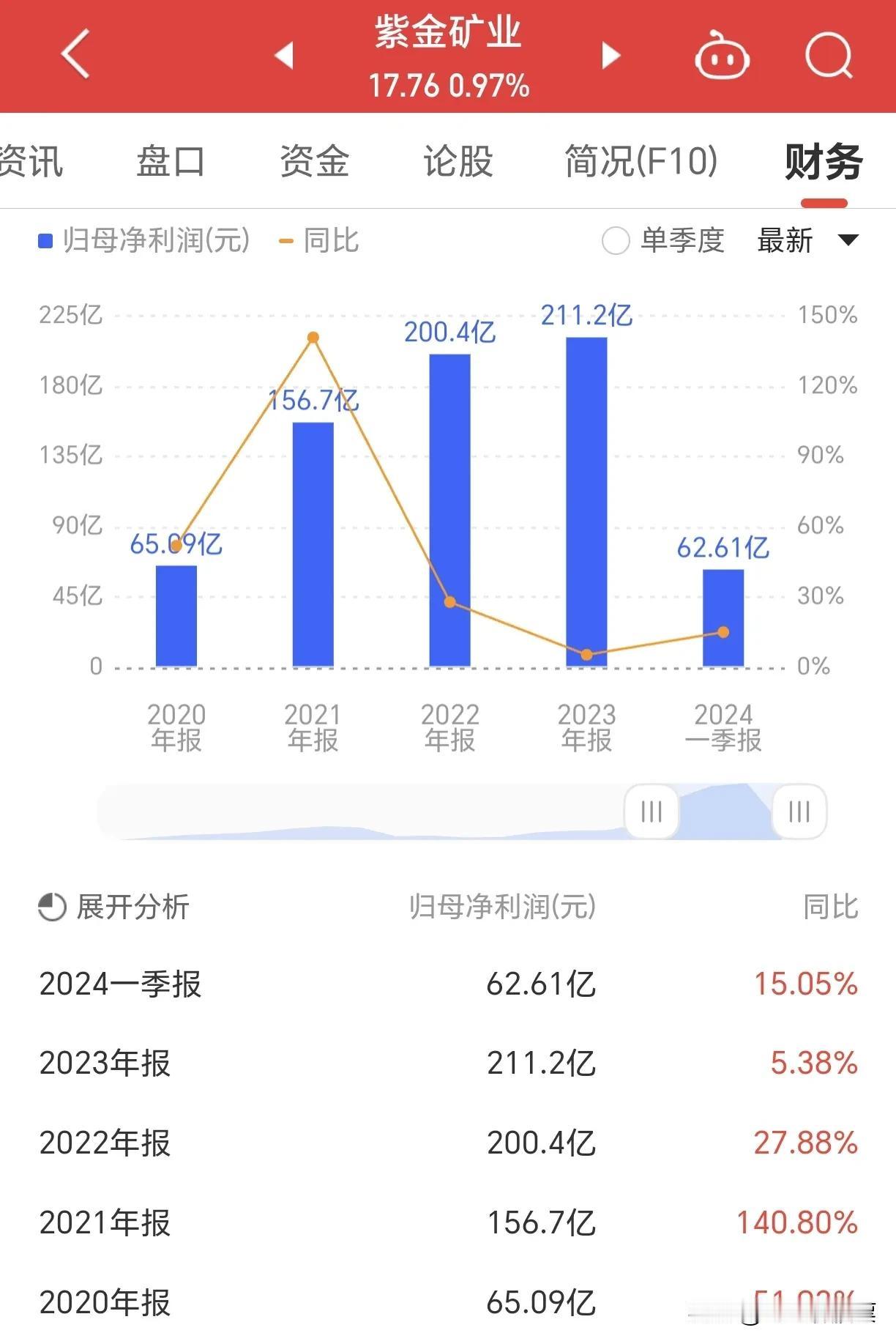 能源矿产作为国家基础发展资源,历来就具有举足轻重的地位,石油天然气,固体矿产,由于坐拥得天独厚的资源优势,这类上市公司近几年表现相当不错,就拿紫金矿业来说吧,2018年其股价最低2.16元,到了2024年,最高涨到19.79元,其业绩也相当炸裂,2020年净利润65.09亿,2023年最高涨到211.2亿,2024年一季度,实现净利润62.61亿,同比下滑15.05%。但是其营收其实表现逐年欠佳,2021年至2023年,营收增速逐渐降低,2023年最高达到2934亿,2024年一季度为747.8亿,同比下滑0.22%。