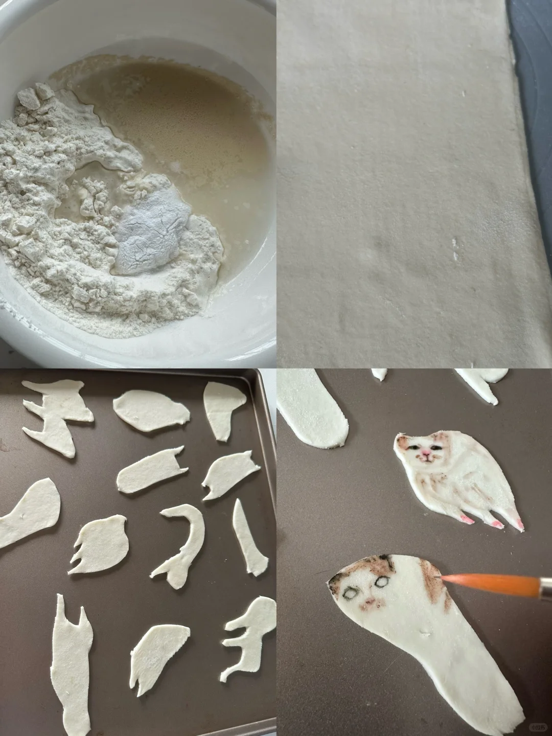 1.面团配料混合均匀揉光滑,擀薄,用刀乱割出猫猫形状(越怪越好)