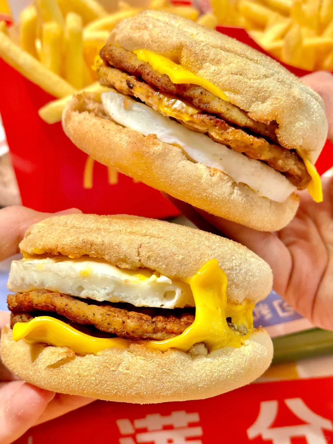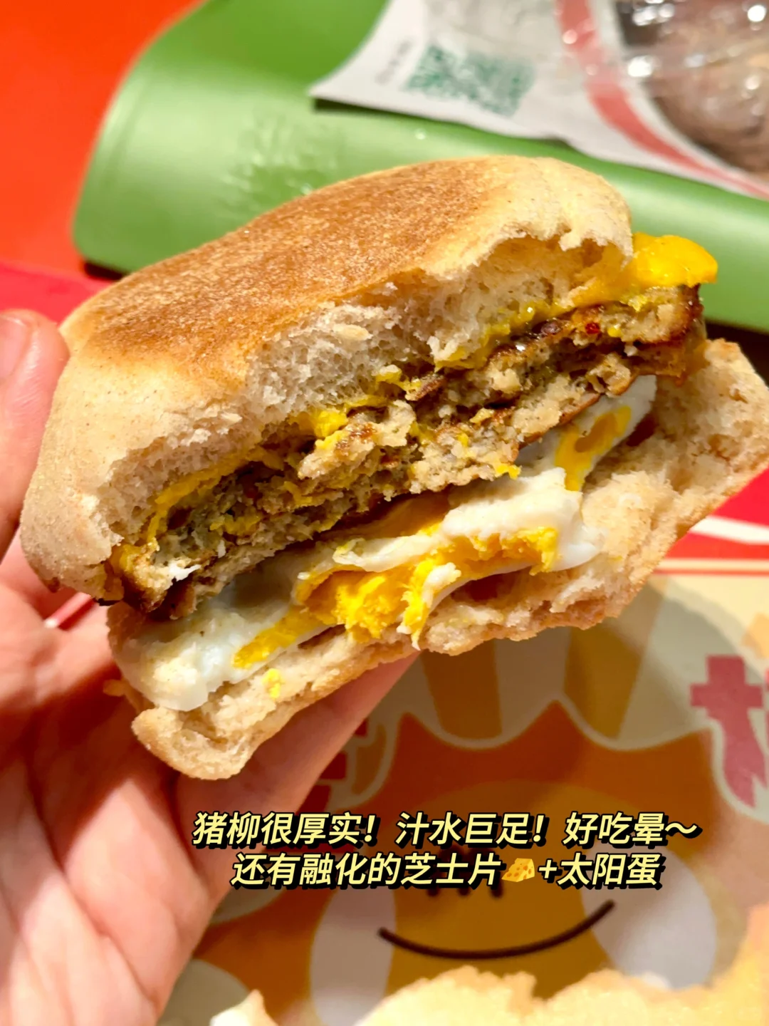 😍我坠爱的双层猪柳蛋麦满分!!拿到手新鲜热乎的,真的太香啦~每一口都能吃到鲜嫩多汁的猪柳!有蛋又有肉搭配融化的芝士片~好吃晕!