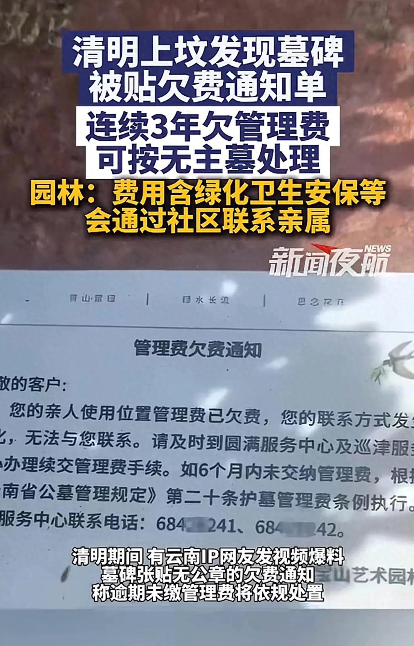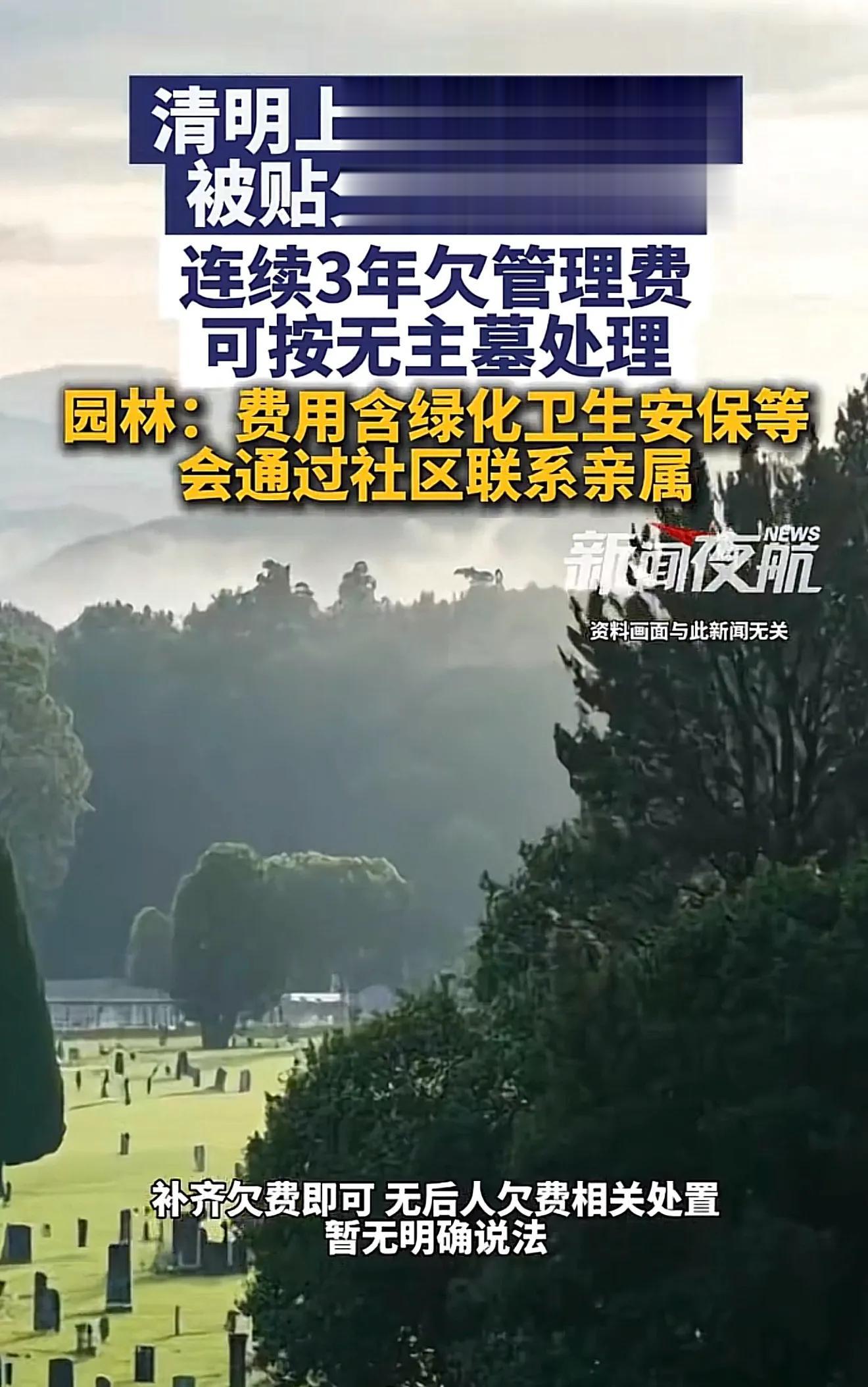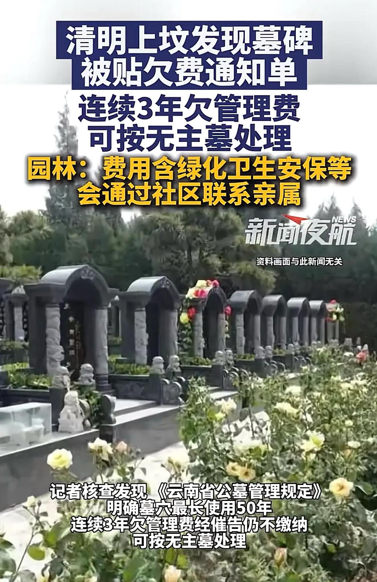 近日某地一公墓墓碑被张贴无公章欠费通知单,通知逝者家属要缴纳墓园管理费,逾期未缴纳的会依规处理,到底怎么个依规处理,按照相关规定,如果不按期缴纳欠费,该墓地就会按照无主墓处理,什么是按照无主墓处理,大白话当然也就是收回该墓地,再出售给他人了!