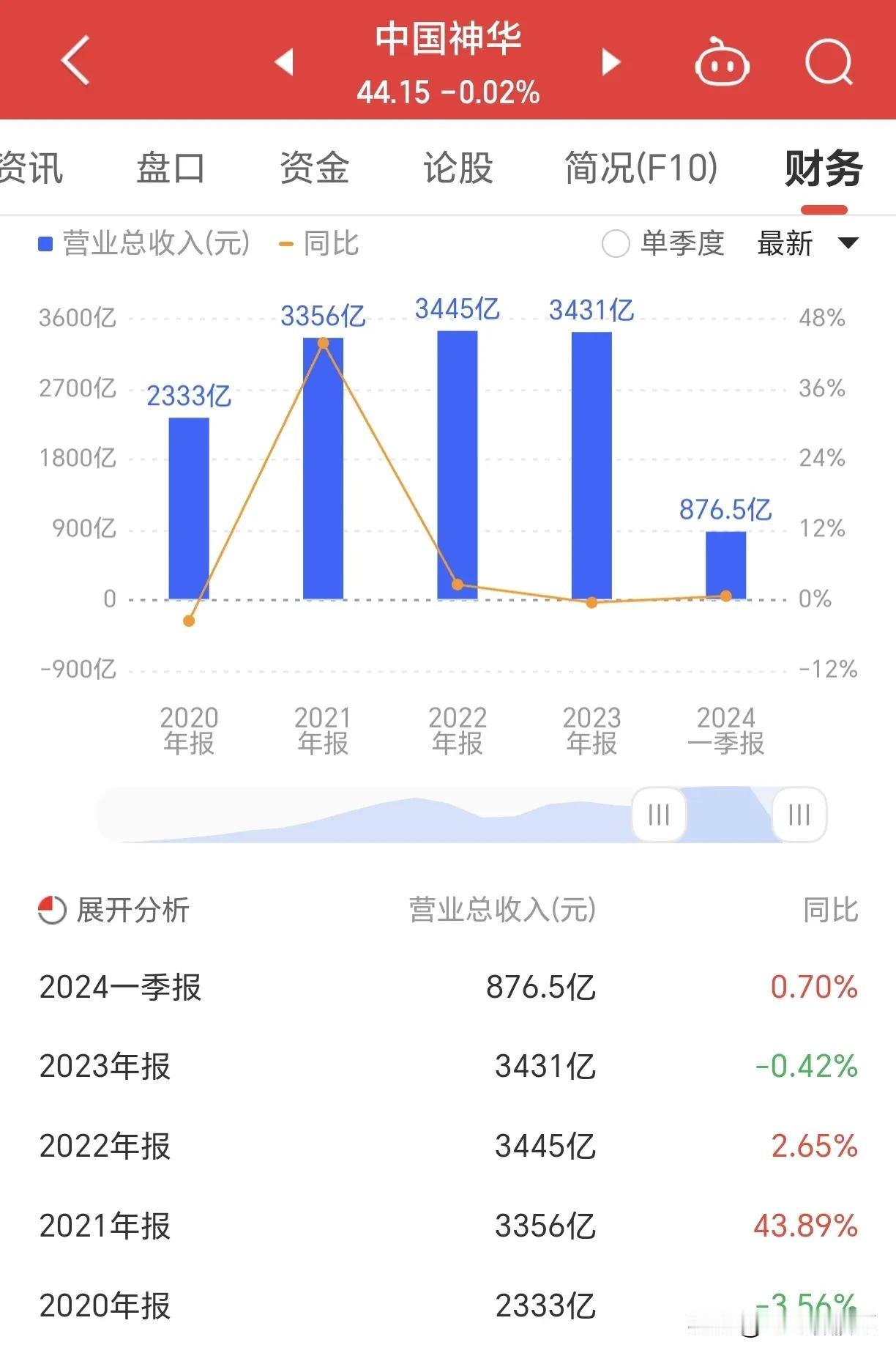 提起煤炭股,中国神华当之无愧的老大哥,2022年为其业绩高峰期,当年实现营收3445亿,实现净利润696.5亿,2023年有所下降,仅实现营收3431亿,实现净利润596.9亿,2024年一季度实现营收876.5亿,同比增长0.7%,实现净利润158.8亿,同比下滑14.66%。