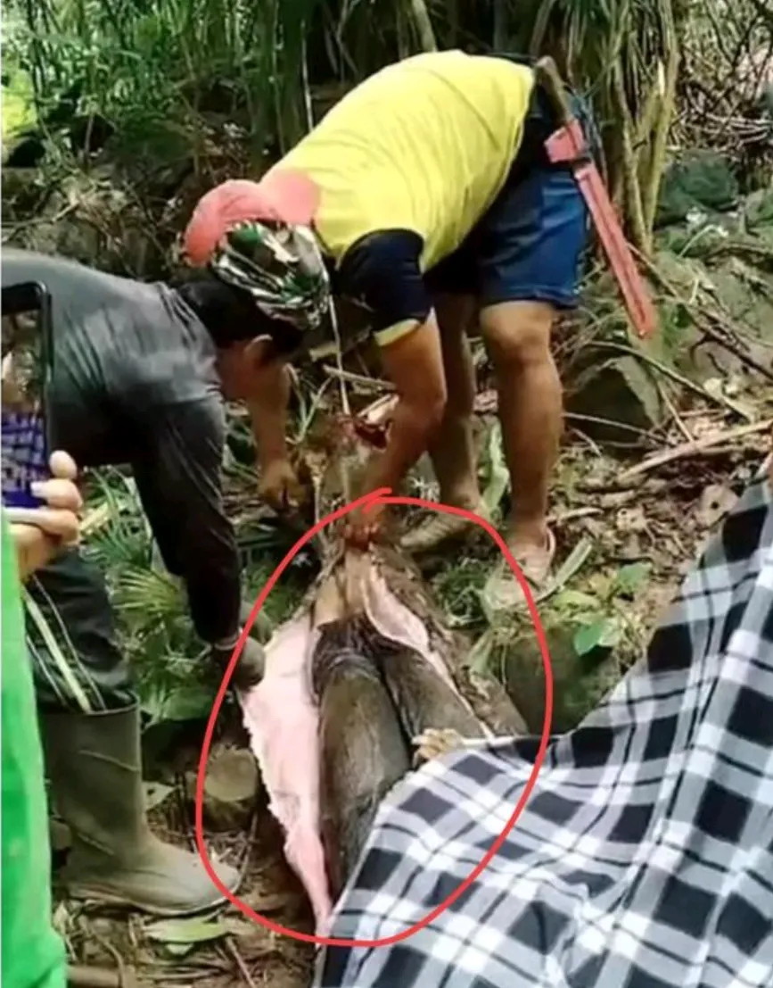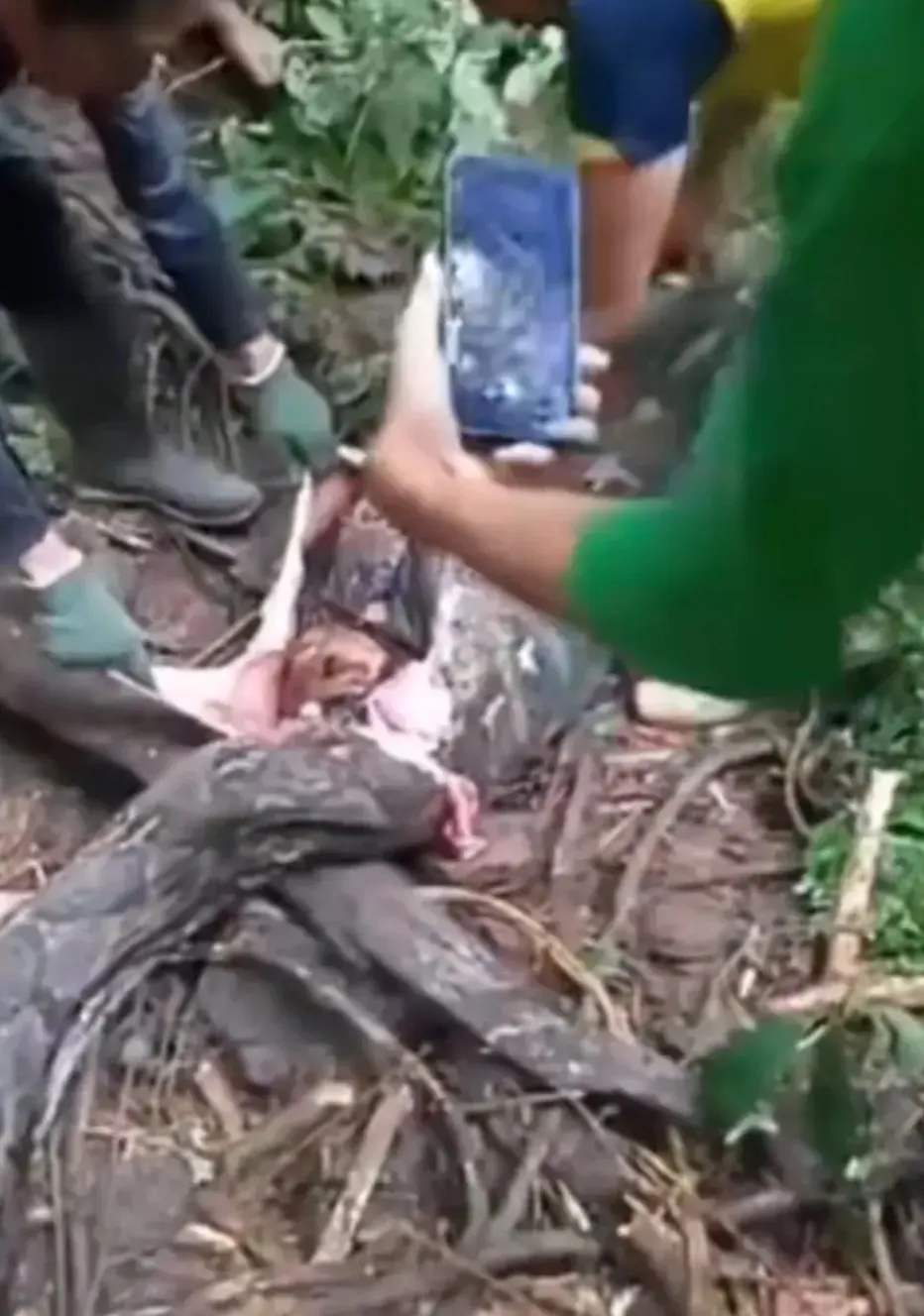 印尼巨蟒吞食一妇女 据媒体消息,6月6日,印度尼西亚中部一村妇被巨蟒吞食。村民抓住巨蟒,剖腹取出村妇尸体。 现年45岁的村妇,已经是四个孩子的母亲,在6日晚回家的路上失踪,他丈夫找到一条5米多长的巨蟒,怀疑是它所为,动员村民一起把它抓获,剖腹取出已经死亡的完整尸体。 巨蟒体型大,生吞猪羊没问题,也能吃人,像西游记里的蟒蛇精一样,非常可怕。 人类应该善待和保护野生动物,但是也应该保持警惕,防止被伤害。