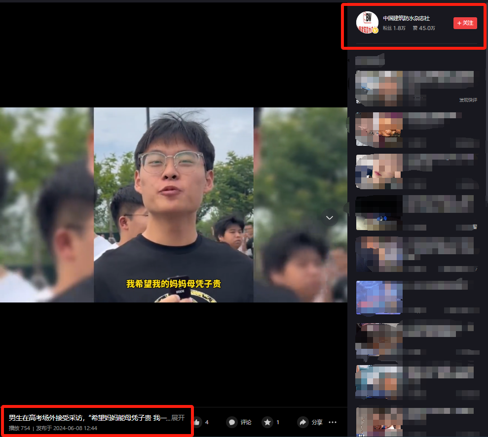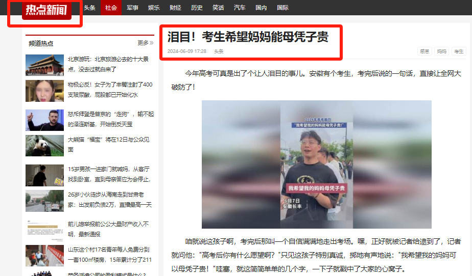 (本文主要参考信源:①中国建筑防水杂志社.收起男生在高考场外接受采访,“希望妈妈能母凭子贵 我一定能考上”.2024.06.08;②中华网·热点新闻.泪目!考生希望妈妈能母凭子贵.2024.06.09)