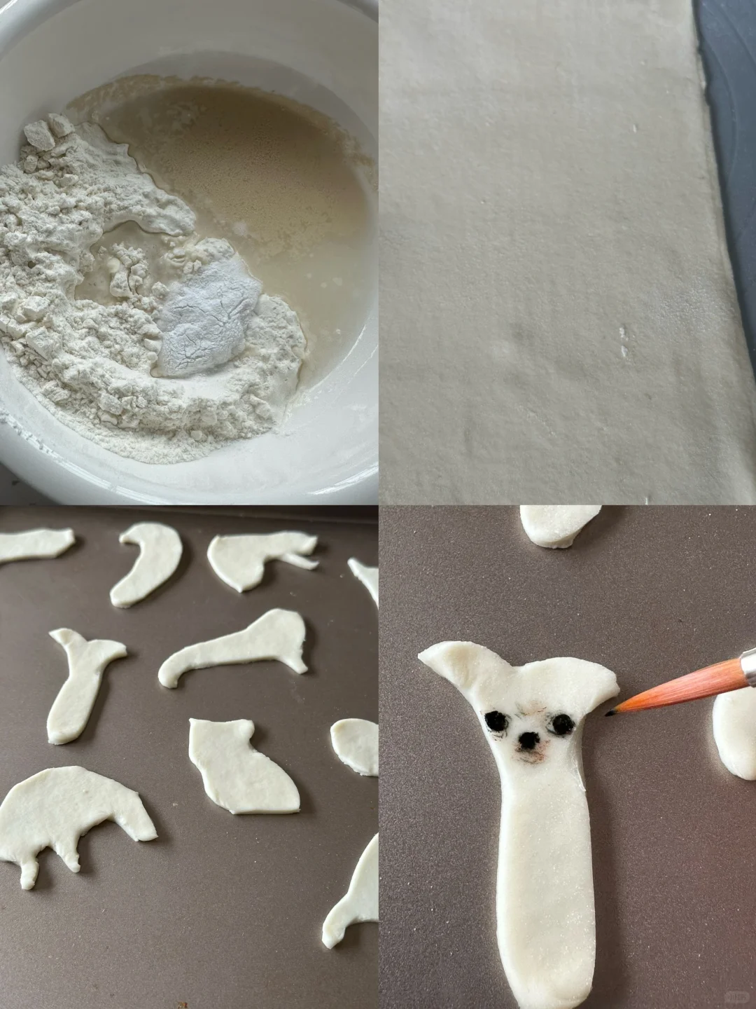 1.面团配料混合均匀揉光滑,擀薄,用刀乱割出狗狗形状(越怪越好)
