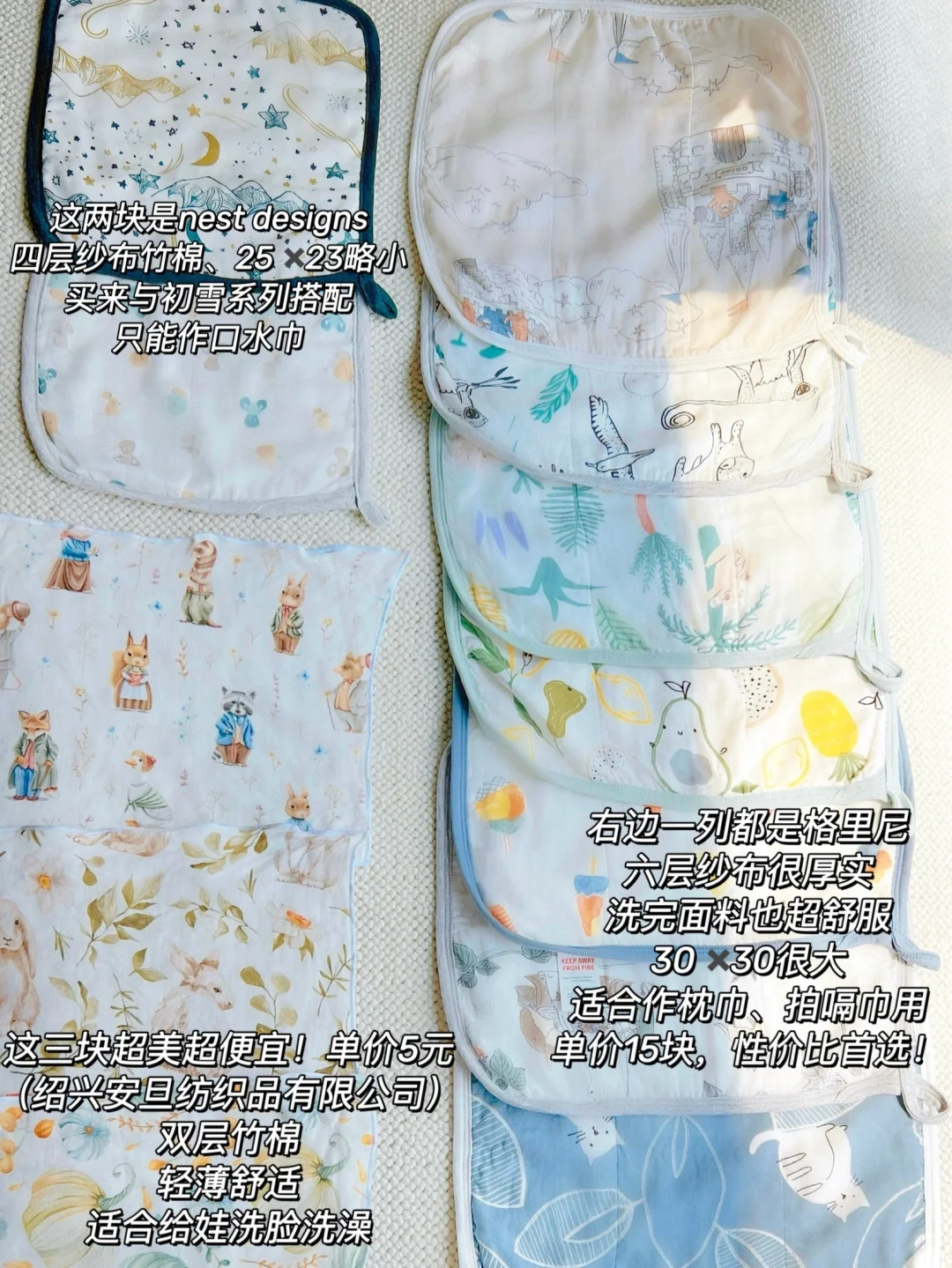 我选择的大多是纱布巾,纱布巾一般是棉➕竹棉材质,比纯棉更柔软亲肤透气吸水,越洗越柔软,更适合夏季宝宝,不同厚度的纱布巾基本可以满足所有需求。