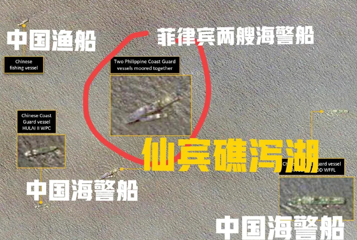 仙宾礁形势恶化!最新卫星图显示,菲今天又派出一艘44米级海警船进入仙宾礁,并与已坐滩57天的“马格巴努亚”号船捆绑在一起!