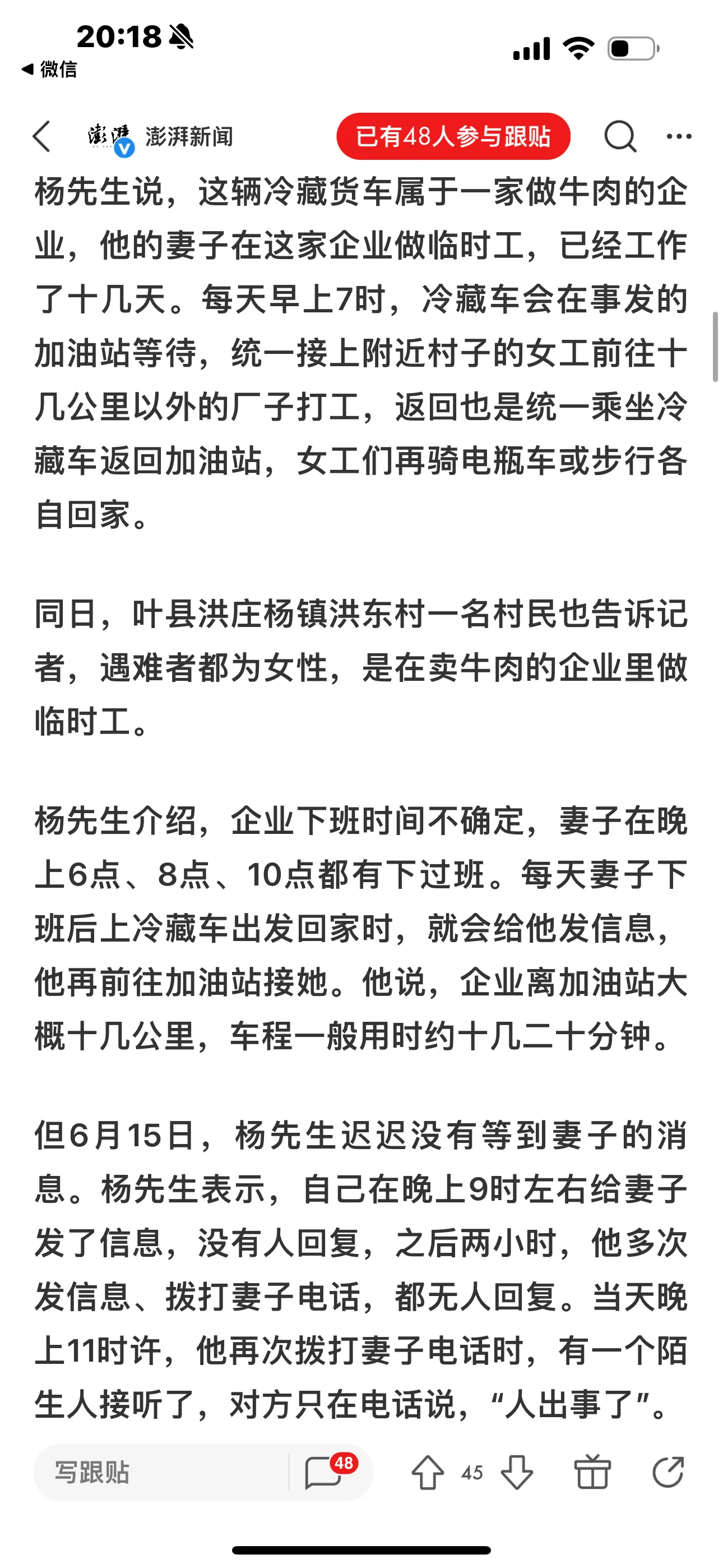 他飞奔去加油站的冷藏车出事点,现场已经处理得差不多了,围上了警戒线,有人告诉他,冷藏车里装了好多牛肉,还有制冷的干冰,只剩窄小的空间,都不知道8位女工是怎么坐上去的。平时她们也坐这种冷藏车上下班,里面是空的,没装货物,都安然无恙,周围人都怀疑这次是干冰泄露,在窄小的空间瞬间释放出二氧化碳,才酿出了事故。
