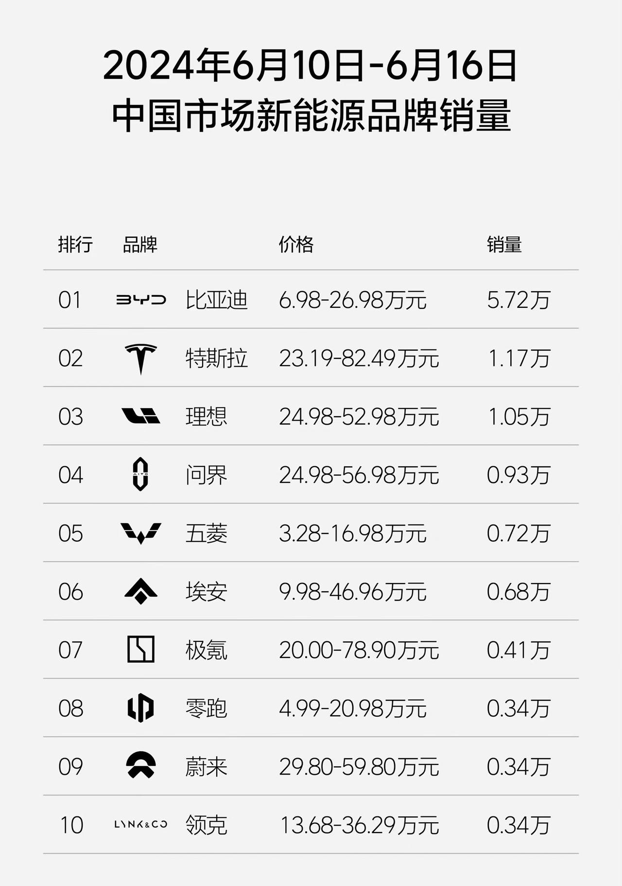 【2024年第24周(6.10-6.16)新能源车销量榜单】 新势力品牌榜: 理想第一,周销量1.05万辆,连续两周交付量过万; 问界第二,周销量0.93万辆,已连续三周交付量同比增长,这与问界新M5和问界M7 Ultra开始大批量交付相关; 极氪第三,周销量为0.41万辆,与上一周销量基本齐平; 紧随其后的是零跑、蔚来和深蓝,周交付量均在0.31万辆以上,排名与上周保持一致。 总品牌销量榜: 比亚迪领先,周交付量达到5.72万辆; 特斯拉第二,周销量为1.17万辆; 随后是理想、问界、五菱和埃安。【来自懂车帝车友圈】