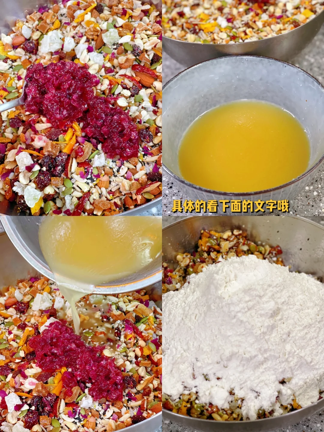 坚果和果脯弄好以后用剪刀弄成小碎,花生外衣去掉用擀面杖碾碎一些,别太碎哦