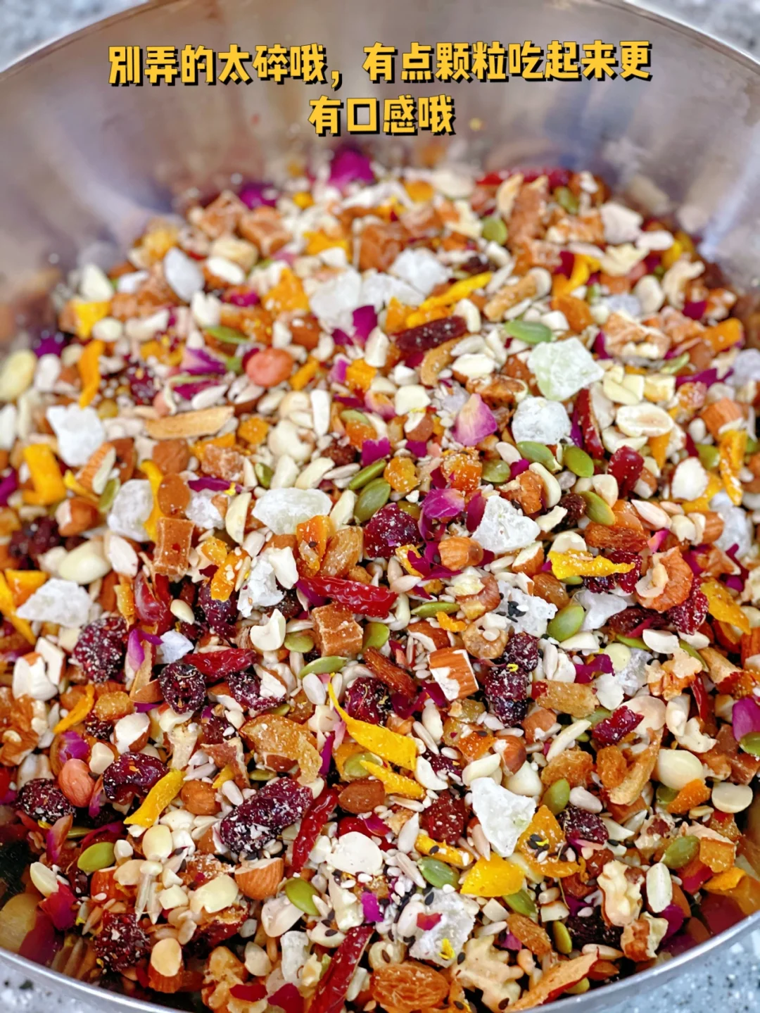 我这里有花生,核桃,榛果,南瓜籽,葵花籽,大杏仁,扁桃仁,黑芝麻、白芝麻,山楂条,冬瓜条,葡萄干,芒果干,蔓越莓【陈皮丁不喜欢的就别放很多人受不了那个味道】红枣,玫瑰花,桂花