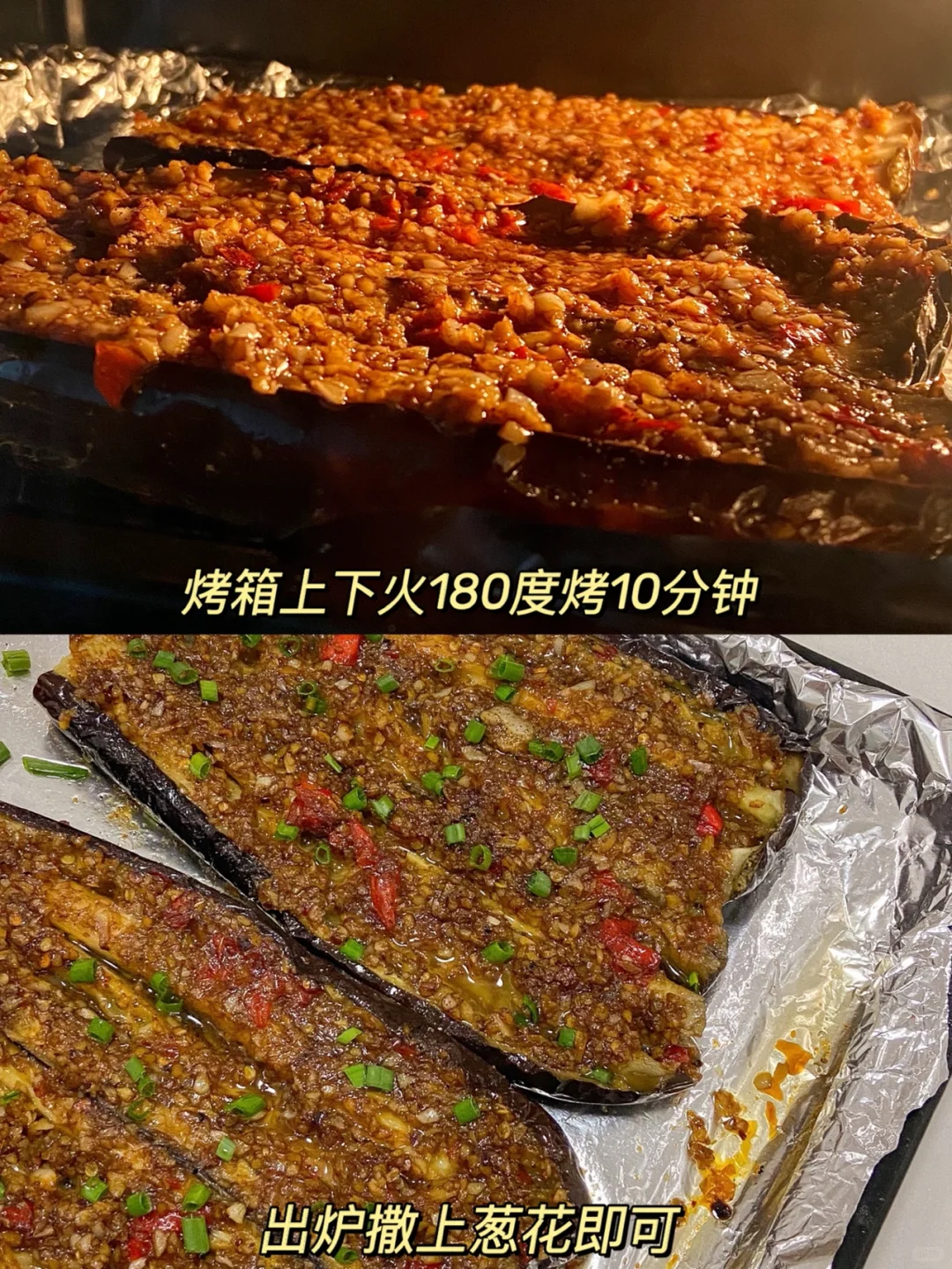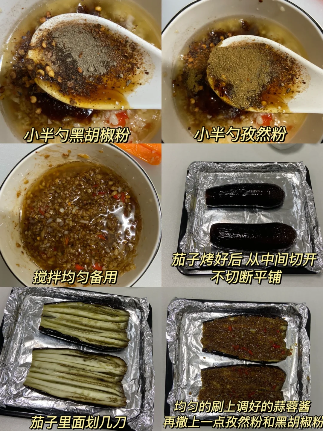 7️⃣ 茄子里面划几刀 均匀的刷上调好的蒜蓉酱 再撒上一点孜然粉和黑胡椒粉 烤箱上下火180度烤10分钟 出炉撒上葱花即可