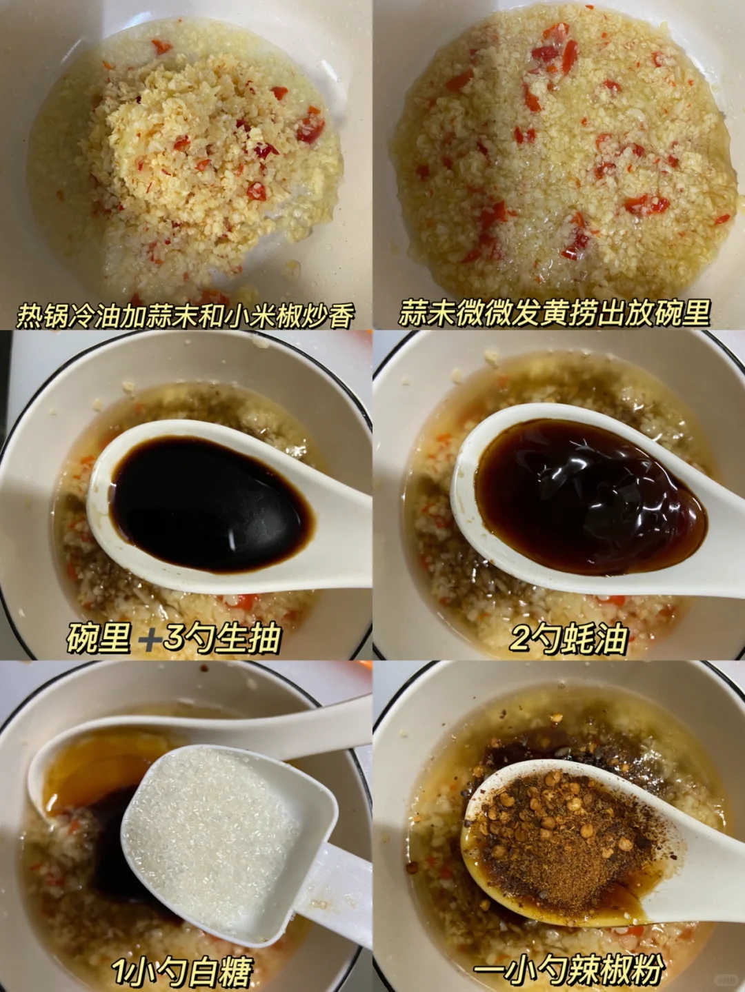 4️⃣热锅冷油加蒜末和小米椒炒香 蒜未微微发黄捞出放碗里