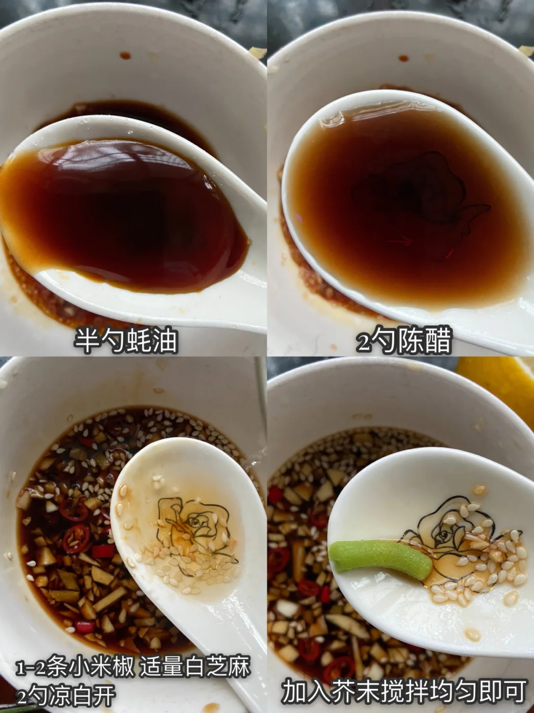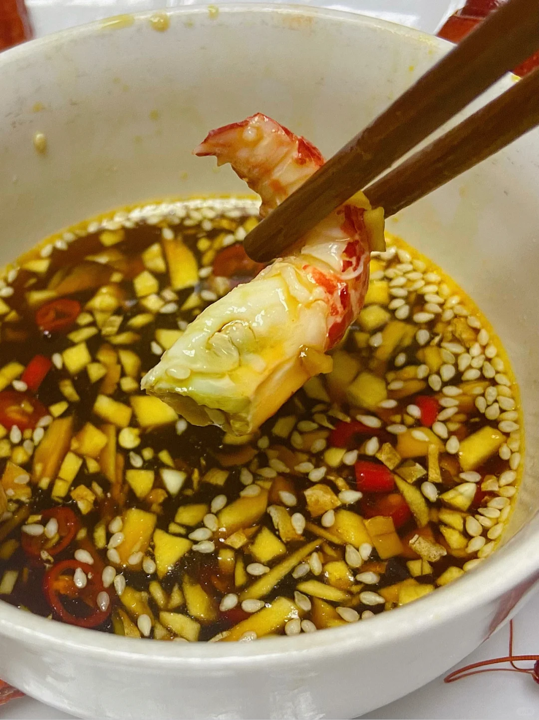 4️⃣调碗神仙蘸料:蒜末姜末+1大勺白糖+1小勺红糖+2勺生抽+半勺蚝油+2勺老陈醋 +小米椒+白芝麻(喜欢蘸芥末的也可以加一点芥末 小龙虾剥开蘸酱就可以吃啦)这个蘸什么都好吃[赞R]平时还有拿来蘸饺子 螃蟹啥的