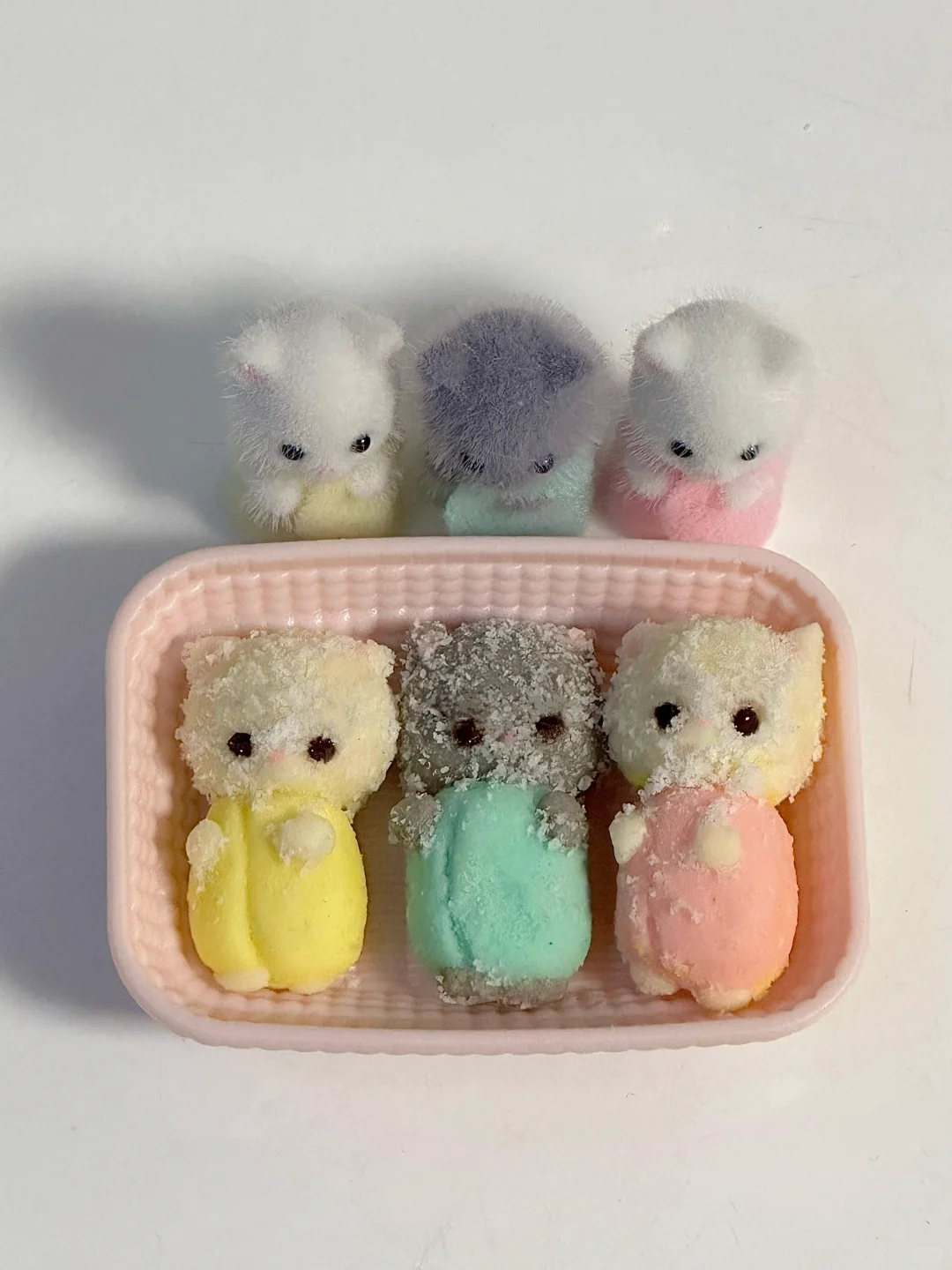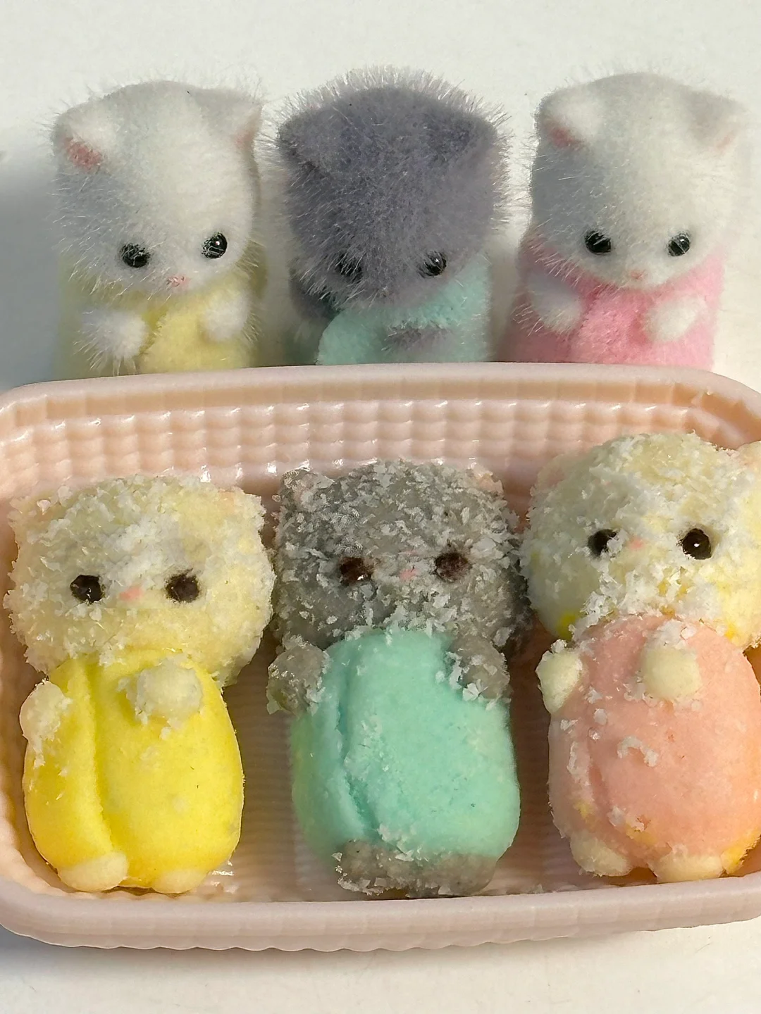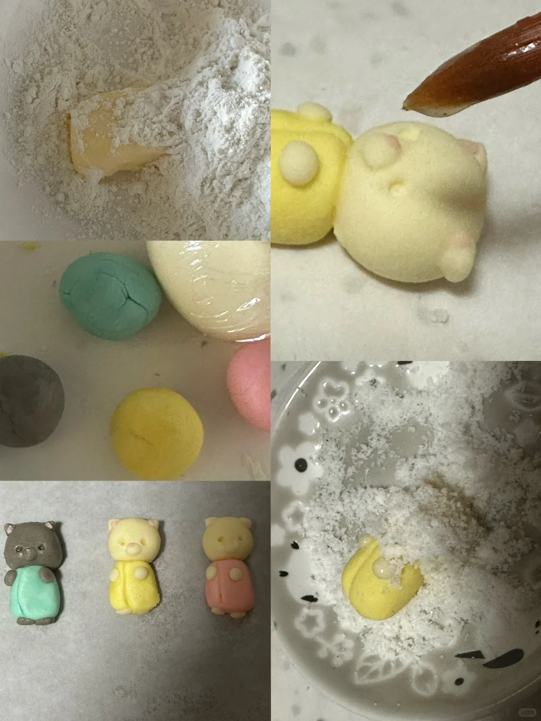 哪个小鼻噶是真的,哪个小鼻噶是假的? 配料: 饼干:13g黄油、3g糖粉、15g淀粉、8g面粉 调色:色素、黑芝麻酱 其他:椰蓉、巧克力、糖水 1.黄油软化,加入饼干剩下的配料混合均匀,揉成团,分份调色,捏成波斯猫 2.150度烤15分钟(仅供参考) 3.烤好的饼干冷却晾凉,脸部表面刷上糖水沾上椰蓉,再用融化巧克力画上眼睛