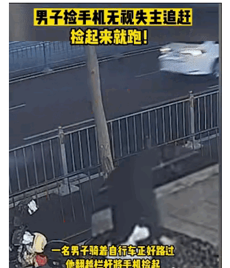 一女子晚上出门扔垃圾时,由于疏忽大意导致手机掉在人行道绿化树下。一名身穿黑色上衣骑着自行车的男子发现后,翻越栏杆将其捡起并放进自己的口袋。