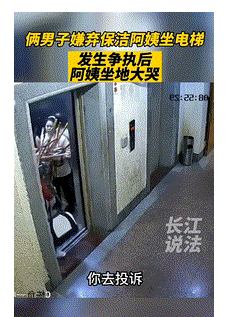 13日,酒店一保洁阿姨推着一辆装满保洁工具的车子乘坐电梯时,两名男子认为保洁阿姨挡住其出电梯,于是其中一名男子指责保洁阿姨,并推保洁工具车导致阿姨脸部受伤后倒地痛哭。