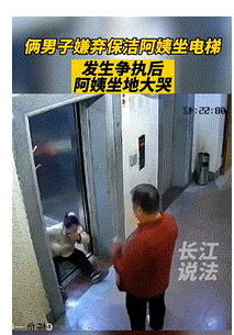 就当该男子第三下去推保洁车时,车上的工具撞到了阿姨脸部,阿姨疼到坐在地上痛哭起来。可红色衣男子却说道“来!叫人家来看,我去叫人家来看!”随后电梯内又走出一名身穿黑色上衣的男子。
