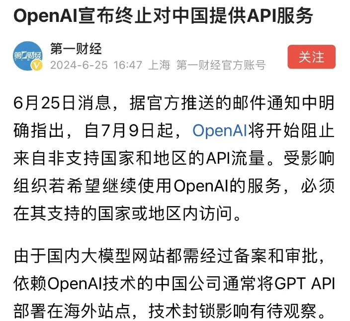 这段时间,Open AI宣布终止对中国提供API服务的消息引起了很大的讨论,一部分人开始担心,离开了美国的支持,中国的AI是否会一蹶不振,国产AI能否接棒?