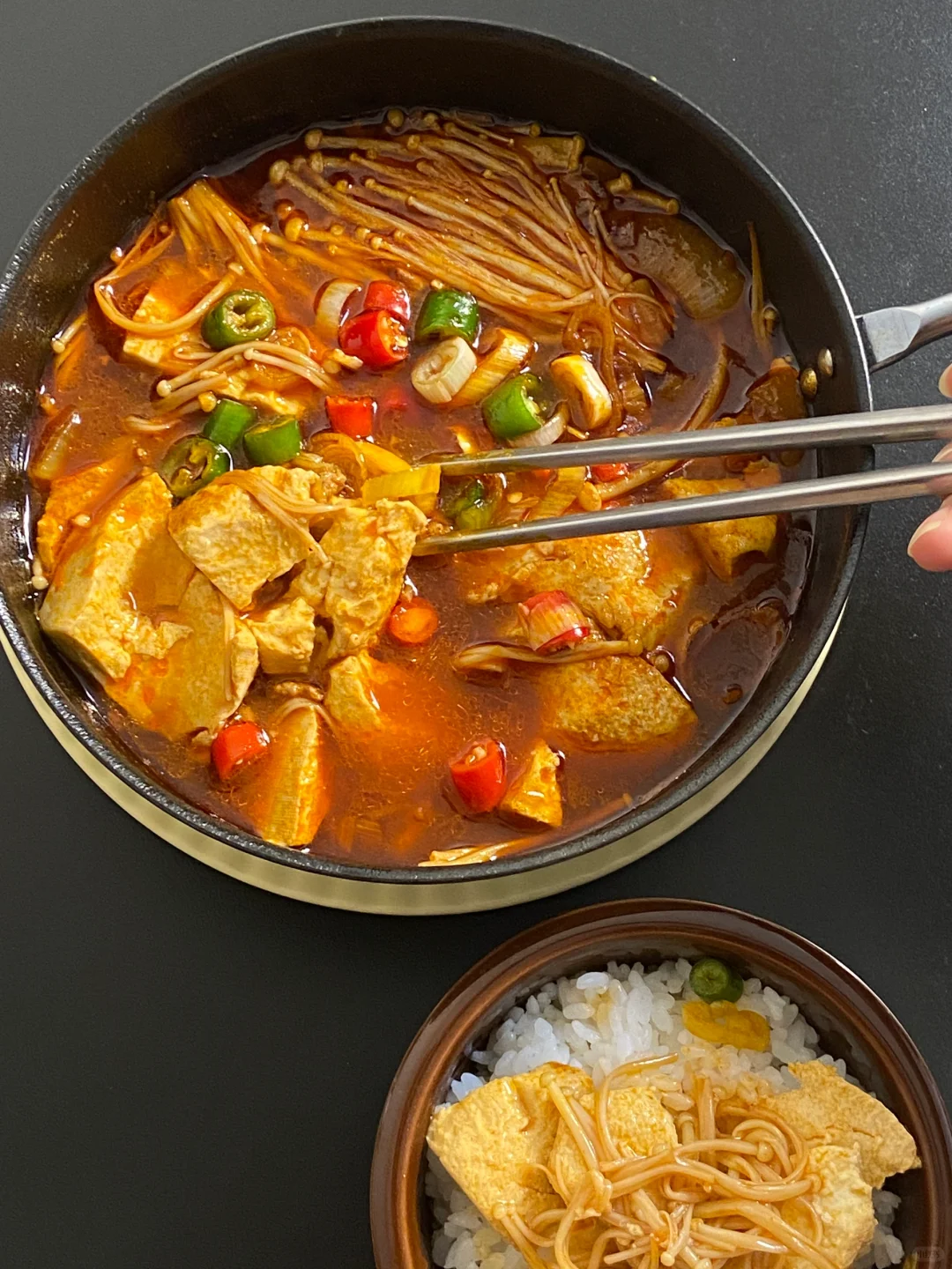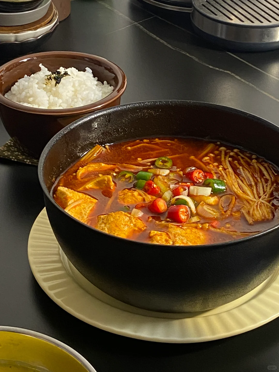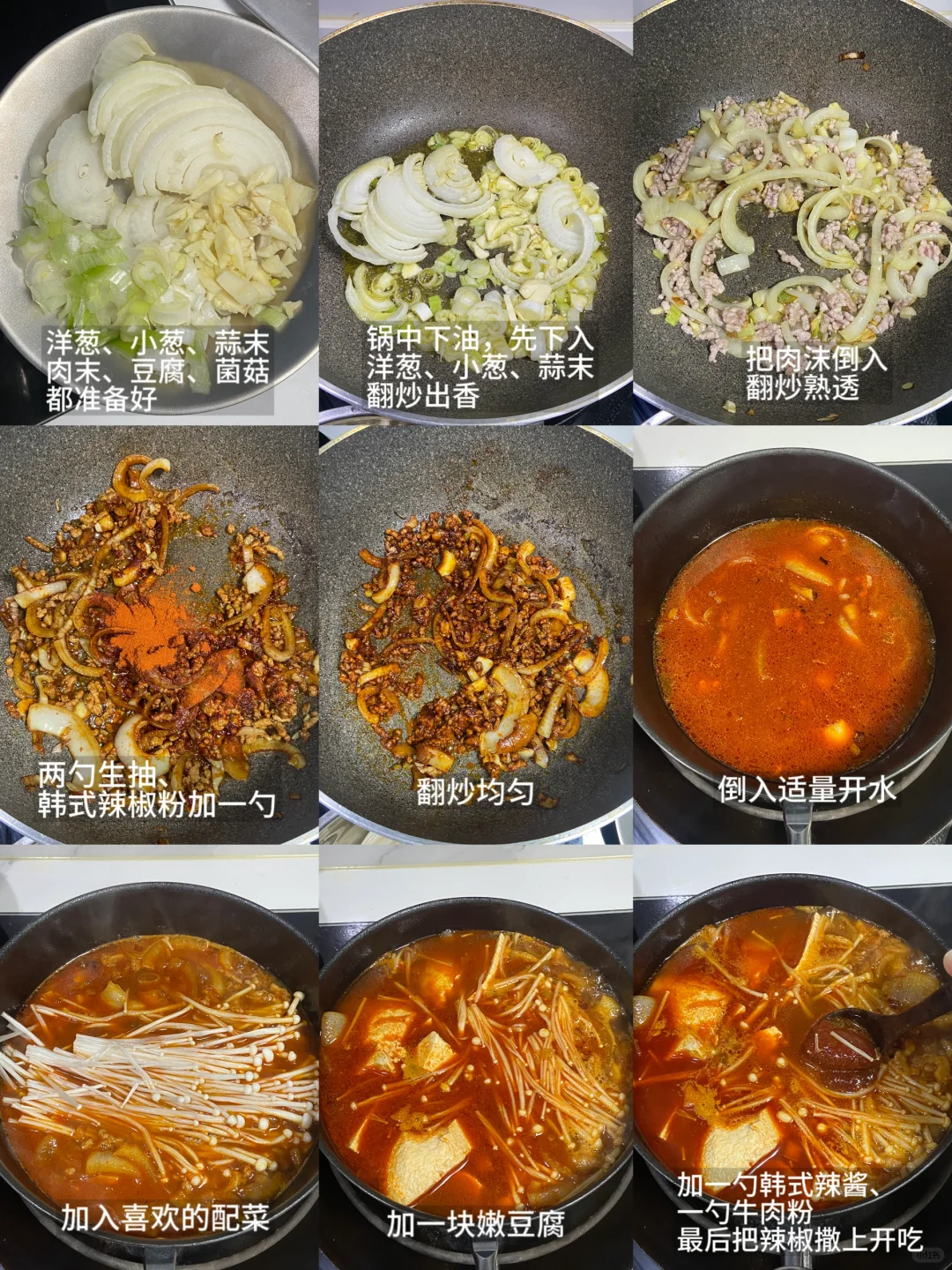 天热提不起胃口的话就来一顿韩式嫩豆腐辣汤,食谱如下: 食材: 嫩豆腐|肉末|洋葱|蒜末|大葱|小葱|小米辣|线椒|牛肉粉 步骤: 1)洋葱、大葱、蒜末准备好,锅中下油,直接一起倒入炒香,再把肉沫倒入炒熟 2)炒熟后加两勺生抽、韩式辣椒粉加一勺翻炒均匀后倒入开水 3)一盒嫩豆腐用勺子挖成小块倒入锅中,再加上自己喜欢的菌菇配菜 4)加一勺韩式辣酱、一勺牛肉粉,最后来一点盐调味,再来点糖中和一下味道,把辣椒圈都放上,开吃