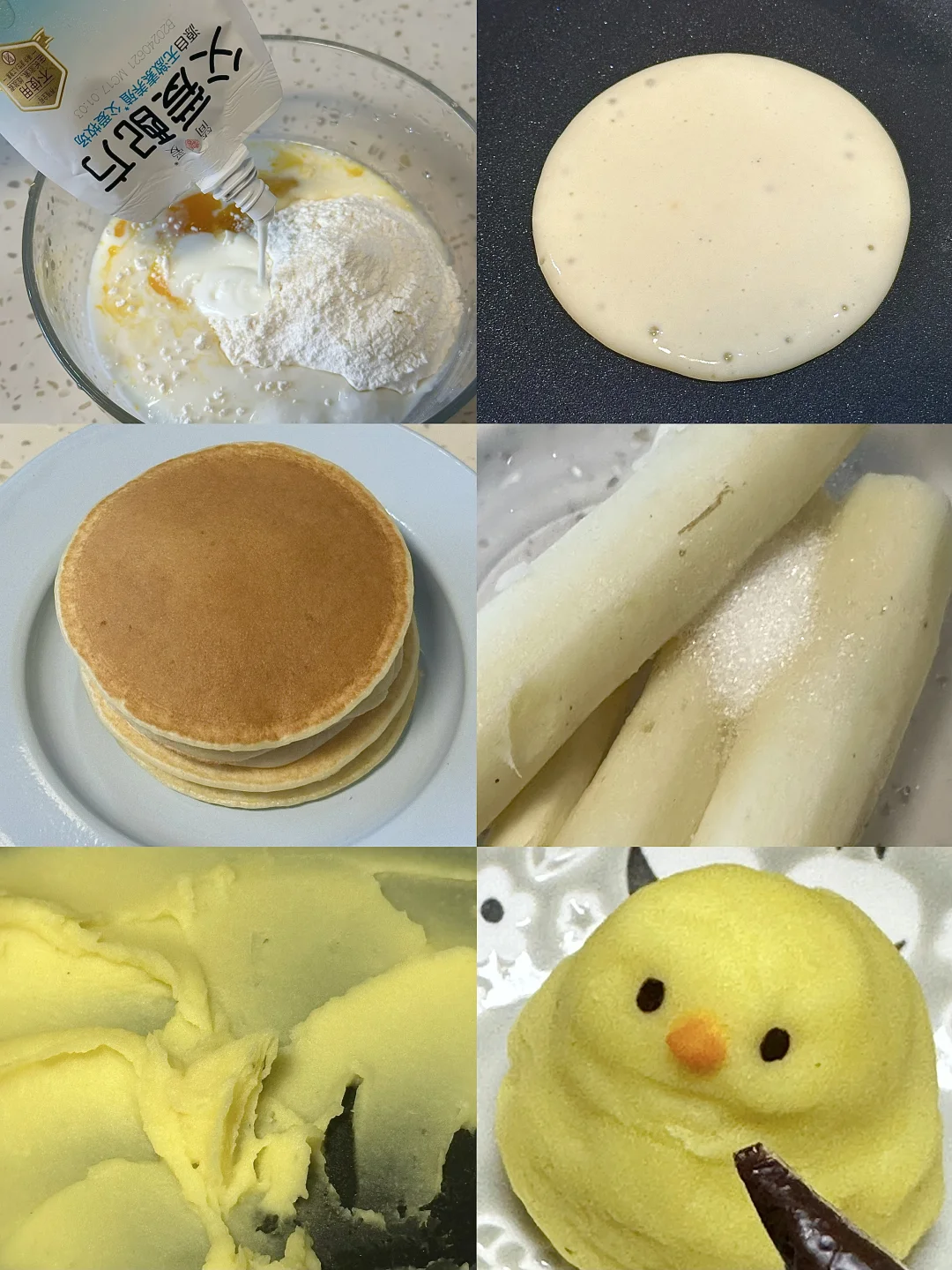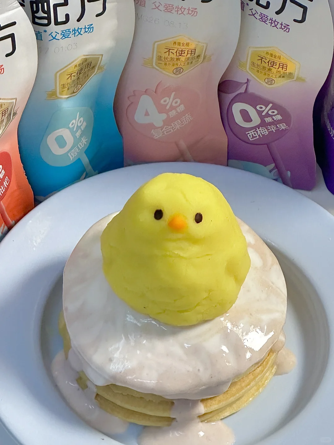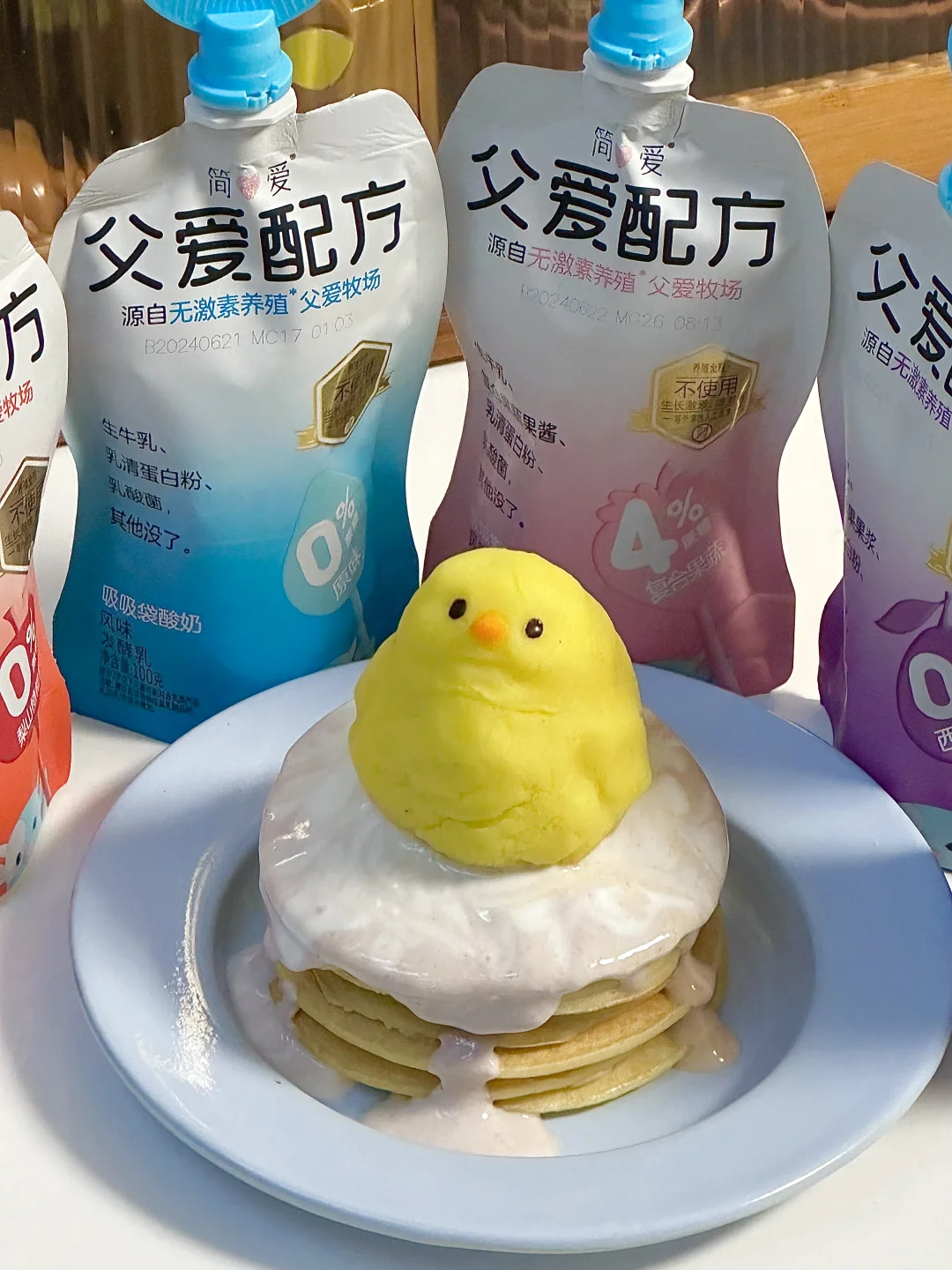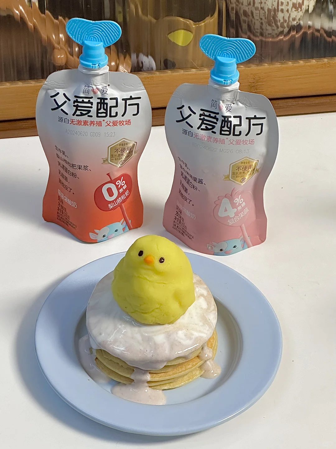请问,真的有小朋友可以拒绝小鸡吗?! 配料: 小鸡:山药、糖、南瓜粉、甜菜根粉、巧克力 松饼:85g低筋面粉、1g泡打粉、一撮盐、7g糖、23g蛋液、38g父爱配方酸奶、95g牛奶 酸奶:父爱配方酸奶(我用了五种口味,滋味丰富,并且每种口味都做到精准控糖,保证口感的同时也注意了营养,奶牛们都在宝宝专属牧场长大,奶源不含外源性人工激素,配料表也很干净!) 1.松饼配料混合均匀,锅里抹油预热,煎至表面冒泡翻面煎熟即可 2.山药去皮蒸熟,加糖压成泥过筛,在锅中炒干水份,加入南瓜粉和甜菜根粉调色,做出小鸡形状,巧克力画上眼睛 3.松饼表面挤上酸奶,再放上小鸡