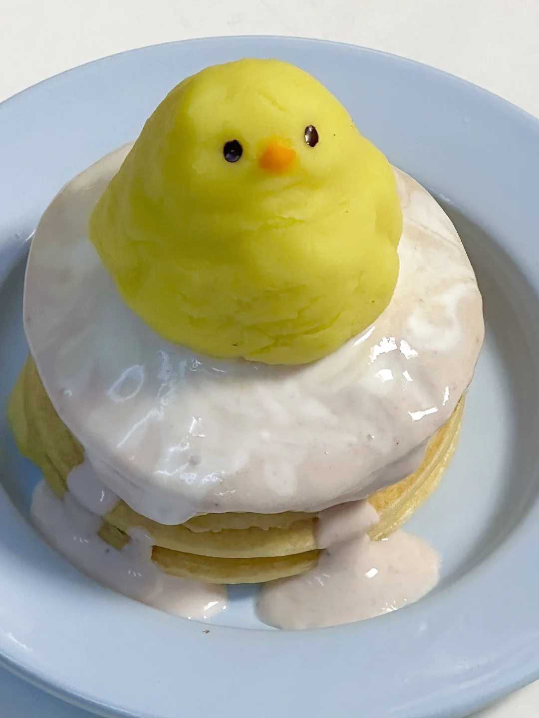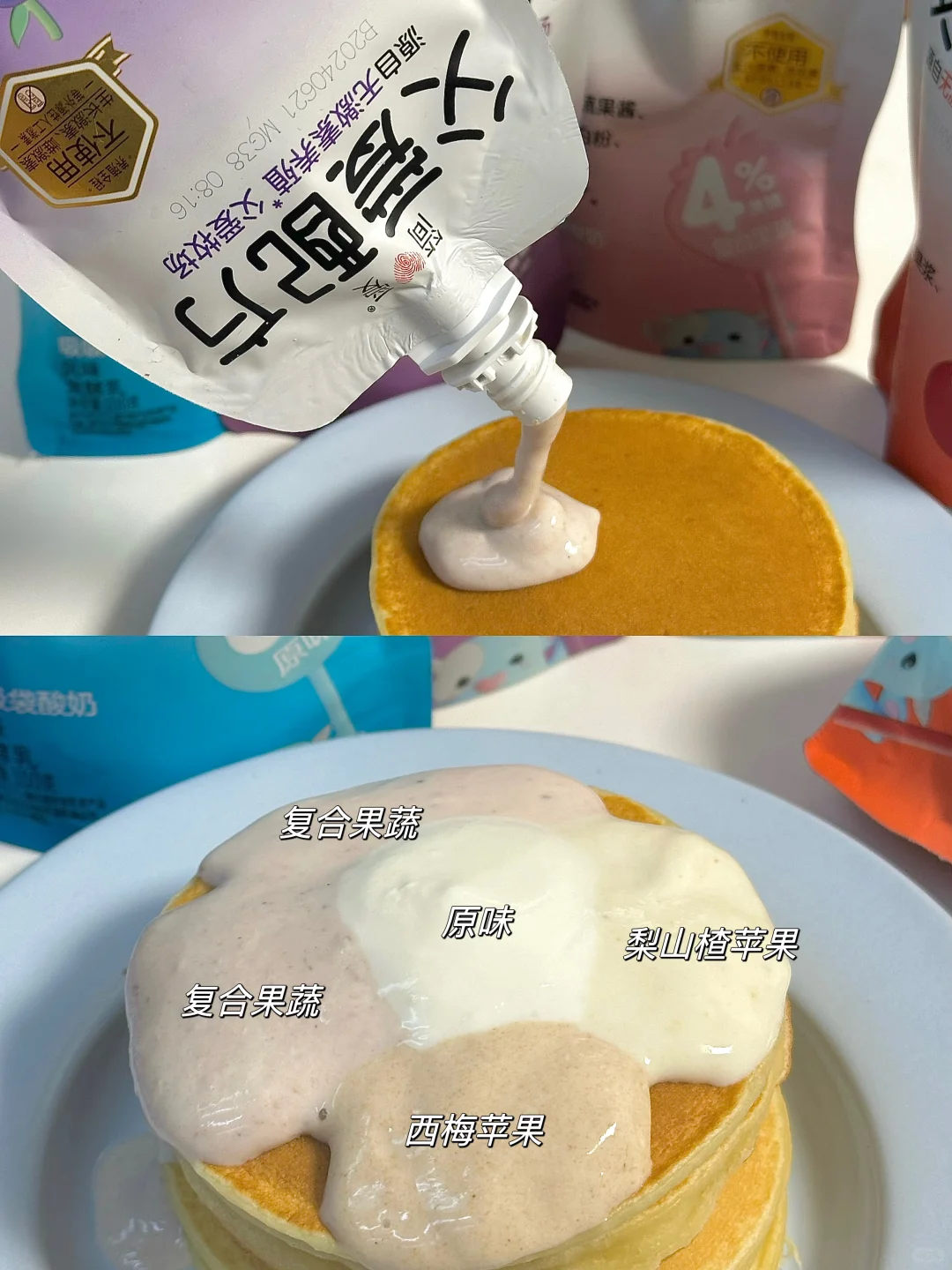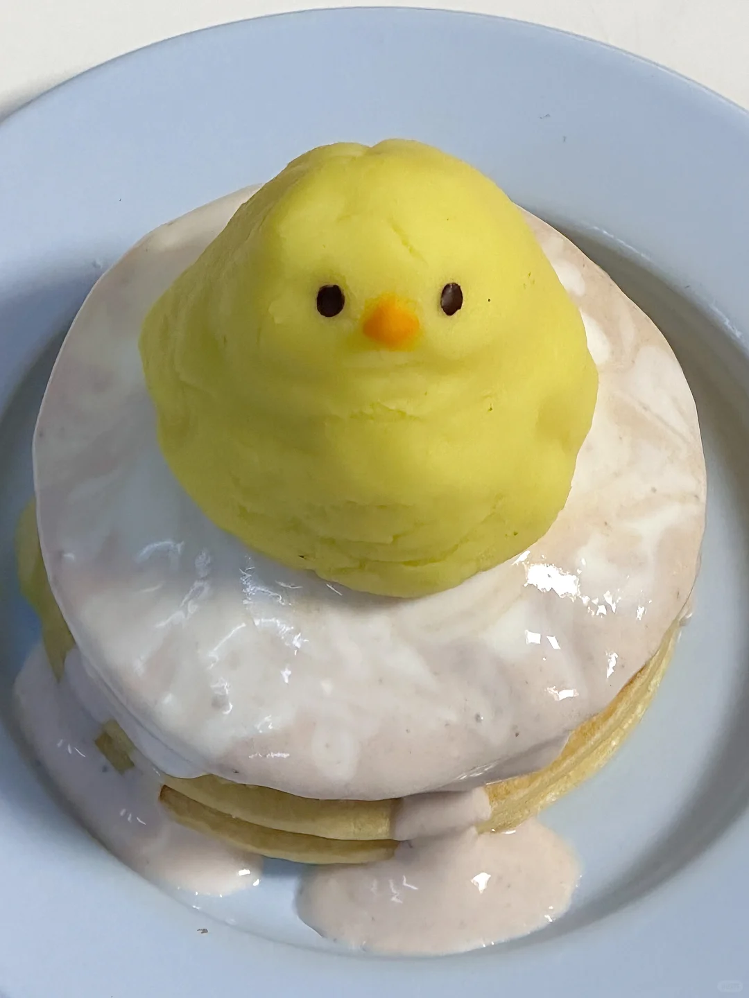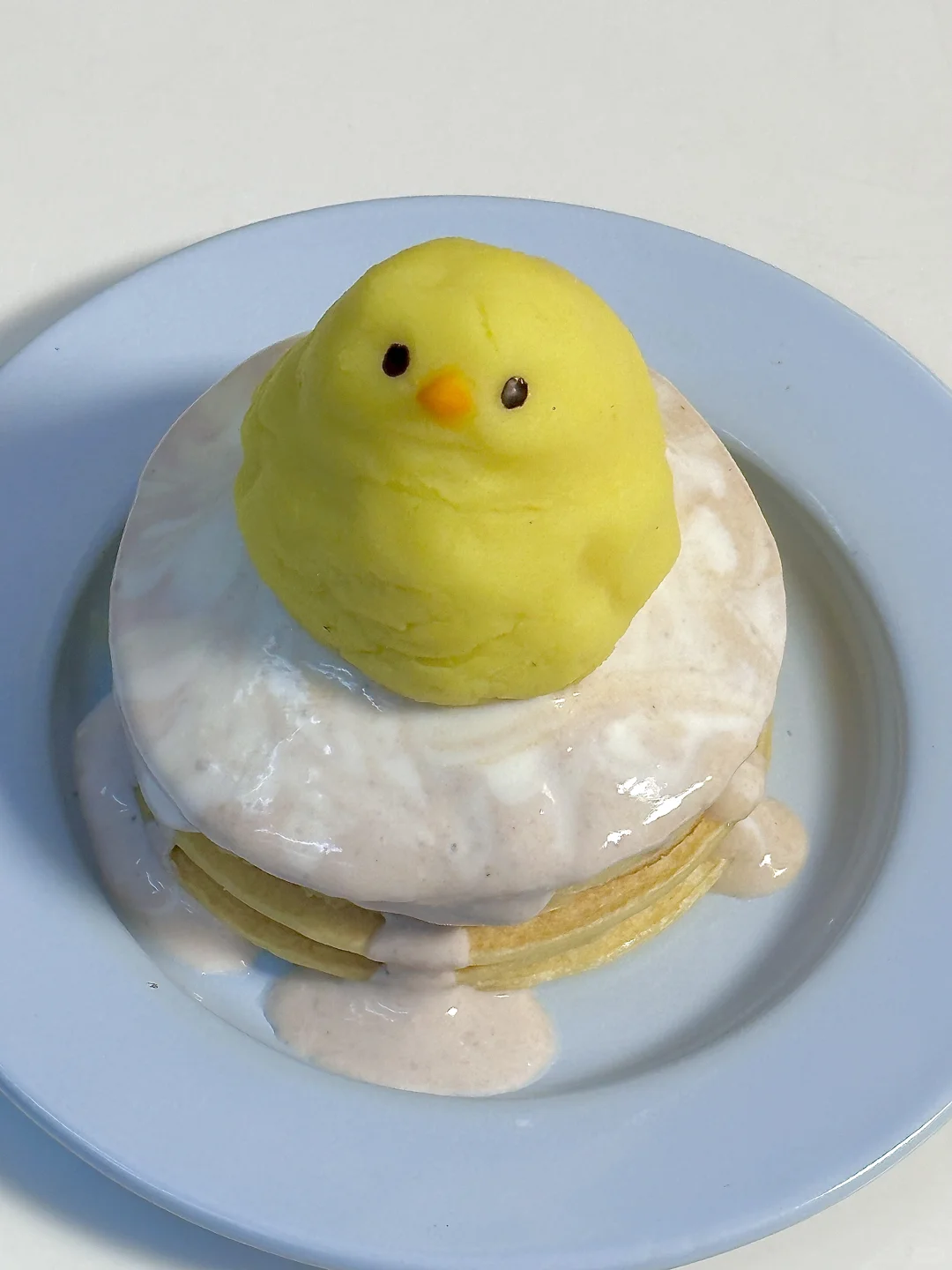 请问,真的有小朋友可以拒绝小鸡吗?! 配料: 小鸡:山药、糖、南瓜粉、甜菜根粉、巧克力 松饼:85g低筋面粉、1g泡打粉、一撮盐、7g糖、23g蛋液、38g父爱配方酸奶、95g牛奶 酸奶:父爱配方酸奶(我用了五种口味,滋味丰富,并且每种口味都做到精准控糖,保证口感的同时也注意了营养,奶牛们都在宝宝专属牧场长大,奶源不含外源性人工激素,配料表也很干净!) 1.松饼配料混合均匀,锅里抹油预热,煎至表面冒泡翻面煎熟即可 2.山药去皮蒸熟,加糖压成泥过筛,在锅中炒干水份,加入南瓜粉和甜菜根粉调色,做出小鸡形状,巧克力画上眼睛 3.松饼表面挤上酸奶,再放上小鸡