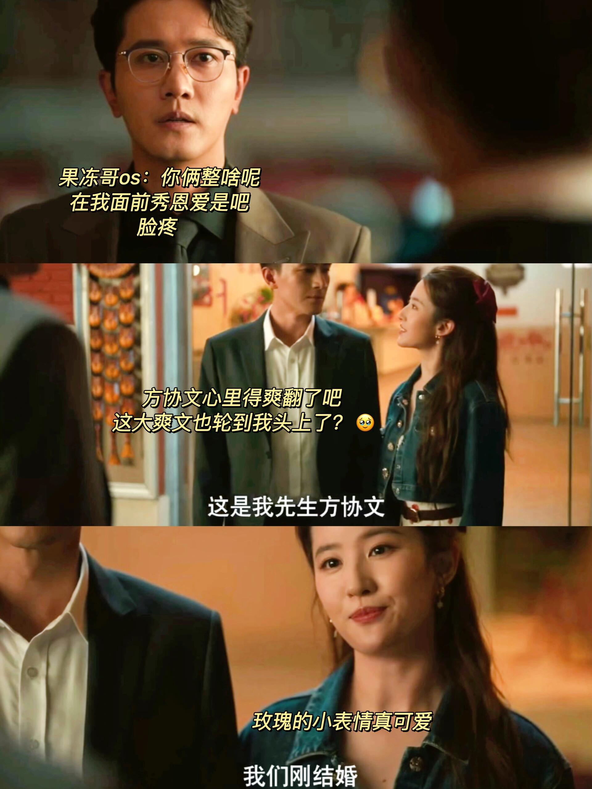 剧名《玫瑰的故事》 玫瑰告诉方协文她和果冻哥的前尘往事并带着他在果冻哥前宣布了他正宫的身份,但是由于方协文内心的自卑还是去主动找果冻哥挑衅了,他俩这段雄竞真是精彩,茶言茶语现任vs心机狐狸前任,俩人都挺能过招的。 其实这会儿的玫瑰和方协文还是挺好磕的,果冻哥来找玫瑰感觉不是单纯的喜欢,就是不甘心啊,不信玫瑰居然喜欢上别人了,所以玫瑰拒绝他了他还是要一意孤行去方协文老家找人家,傻眼了吧。 玫瑰这会儿其实已经给足方协文安全感了,但是正如苏苏说的,他太自卑了,见过庄国栋之后他的嫉妒和不安更具像化了,后面这可能也导致了他在婚姻里极强的控制欲,从而两个人的婚姻走向破裂。