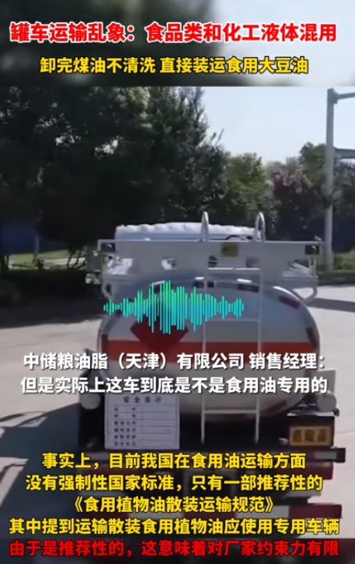 没天理了!如果不是记者暗访曝光,估计14亿国人都没有想到,中字开头的中储粮,竟然还不顾所有人的健康,使用拉完煤油的油罐车,不清洗也不处理,直接拉食用油。你想想看,这得多大的胆子啊! 卸完煤制油的罐车,没有经过任何清洗,竟然直接就装运食用大豆油了,甚至还能装糖或者蜂蜜,真的难以想象,混装真的不会出事吗?人吃下去也不会出事吗? 5月18日,随着记者暗访调查,在河北石家庄某路口,发现了一辆锈迹斑斑的油罐车。 根据记者的询问,司机是从宁夏拉的白油(煤制油的一种)过来卸货。 而煤制油的用途,是用来厨房烧火。 卸完白油后,油罐车也随即离开,但司机并没有发现后面紧紧跟随着的记者。 到了三河市后,司机驾驶着油罐车驶入汇福粮油集团生产厂区。 一个小时后,该油罐车装载着满满一油罐货物离开,而货物,则是一级豆油。 可在记者的一路跟随发现,油罐车周围并没有任何清洗或处理的痕迹,甚至车身上还残留着煤油的痕迹。 记者心中一惊,难道……他不敢想象接下来的画面。 无独有偶,这样的事情也同样出现在天津,而是食用油的厂区,则是中储粮。 5月24日,记者在天津滨海新区发现了一个油罐车,得知司机是从石家庄拉完白油后,是前往中储粮拉食用油的,因此便询问对方对罐内进行了清洗没有。 但司机却一脸无所谓的表示:“能装就装,不能装就算了。” 记者随后发现,该司机驾驶着油罐车,顺利进入中储粮生产厂区,并径直开向了装油台,不一会司机就爬上了灌口,开始了装油。 40分钟后,司机装满了35吨大豆油,随即驾驶着油罐车离开。 看到这里,记者的心中不禁充满了担忧,这种用煤油罐车直接装载食用油的行为,不仅违反了食品安全法规,更是对亿万国人的健康构成了严重威胁。 如果这些被污染的食用油将会流入市场,被亿万国人所消费,一旦这些食用油被检测出问题,那么后果将不堪设想。 但更令他痛心的是,这样的事情竟然在中储粮这样的央企中发生,简直让人难以置信。 在接下来的暗访中,记者还发现,这样的行为并非个例。 煤制油是煤炭经高温高压等程序,处理“化煤为油”,生产出的液蜡、白油等产品。 若这样的化工液体混入食用大豆油,会对消费者的健康构成怎样的威胁?想想都觉得可怕。 有司机表示,可使用液体和化工类液体罐车混用,已经成为了行业的常态,但是换货运输时,就需要清洗罐体。 而一次清洗罐体的费用,就需要四五百块钱。 司机说,如果食用油生产厂区那边的人检查罐体的话,那他们则需要把罐体给清洗一下,如果不检查,那他们就省了这几百块钱。 但一般来说都不会检查的,即便需要检查,也只是“敷衍了事”。 据司机透露,负责人如果检查的话,也就是下去看看罐体上的两个输油口,而司机们只需要把输油口给擦拭干净就行。 更有甚者,只需要司机提供输油口干净的照片就行了。 至于是不是这天的照片,至于是不是这辆油罐车的输油口,负责人完全不在乎。 司机说,他去了好几次,负责人都没有验罐。 而中储粮油脂(天津)有限公司销售经理称:“我们不验罐,我们这正常就是要求,可能是用食用油专用的油罐车,但实际上这车到底是不是食用油专用的,我们也没法去分辨。” 换句话说,这位销售经理也同样知道过来拉食用油的油罐车,可能不是专用的,但他们依然没有去检验,没有去分辨。 事情一经发出,便引起了网友的热议: “真的,再别说农村榨油不卫生了!这么一看,简直良心……” “食品安全,我们每一个人都不能置身事外!” “不是清不清洗的问题,谁能保证清洗干净!食品油罐车应该专车专用!这是怎么了?老百姓的生命就这么不值钱?” …… 其实早在2013年,我国出台的《食用植物油散装运输规范》,对散装食用植物油运输容器的使用,就有着明确的规定,应使用专用容器,不得使用非食用植物油罐车或容器。 但有专家表示,目前推行的运输规范虽然为推荐性国家标准,相关企业也应参照这一标准制定较为严格的企业标准,使用专用罐车运输食用油。 但约束力和强制性,跟国家标准相比,显然是不能相提并论。 若不是记者调查暗访曝光,我们也估计很难发现这一现象。 百姓健康这一路,任重而道远。