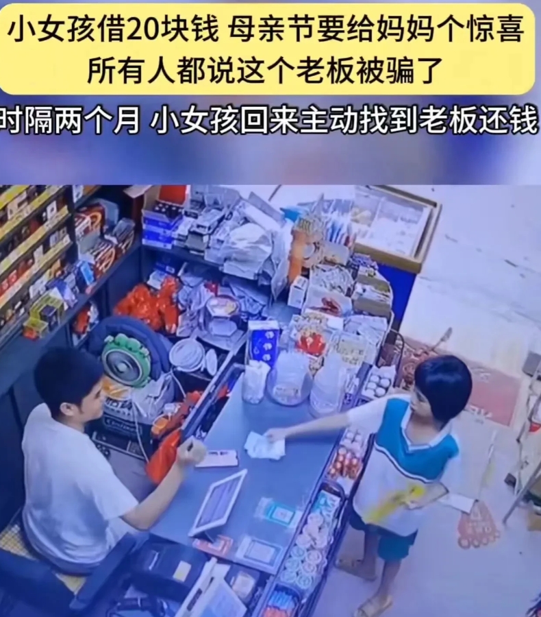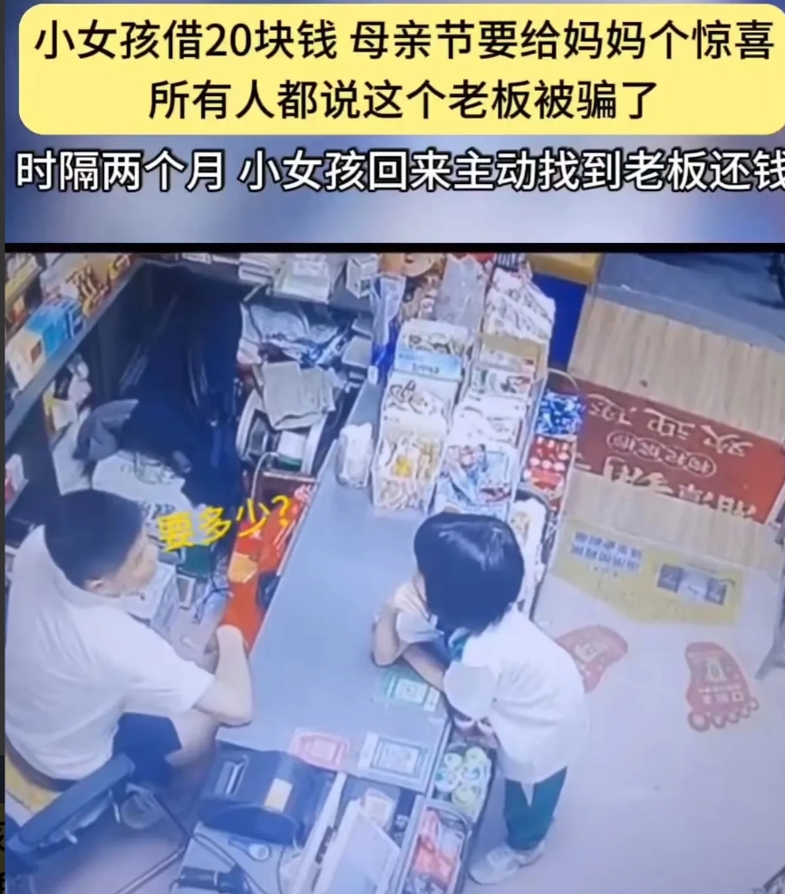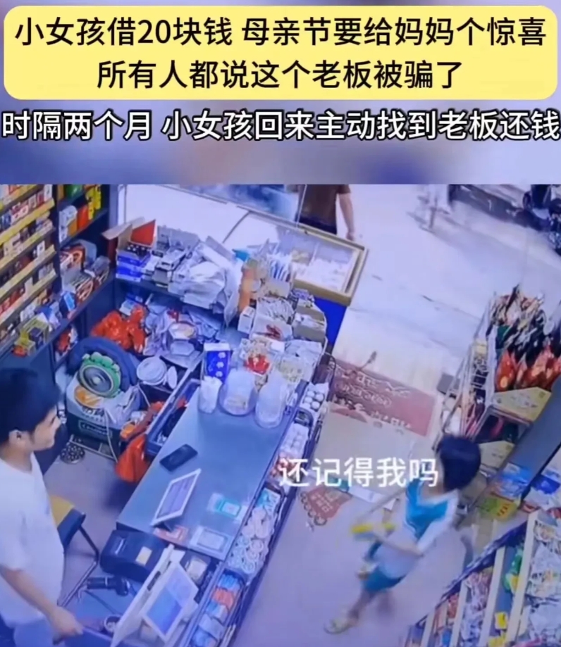 这个小女孩给全网上了一课!广东,小女孩向便利店老板借 20 块钱,说母亲节想给妈妈买礼物。老板很感动,借给了女孩。可是过了很久女孩都没来还钱!老板家人都笑老板肯定被骗了!但2 个月以后,女孩再次来到店里,让老板哽咽!这家便利店的老板是一个年轻小伙,这天晚上他在店里看店,一个小女孩走进店里没有买东西,而是对他说:“哥哥,可以借我一点钱吗?”