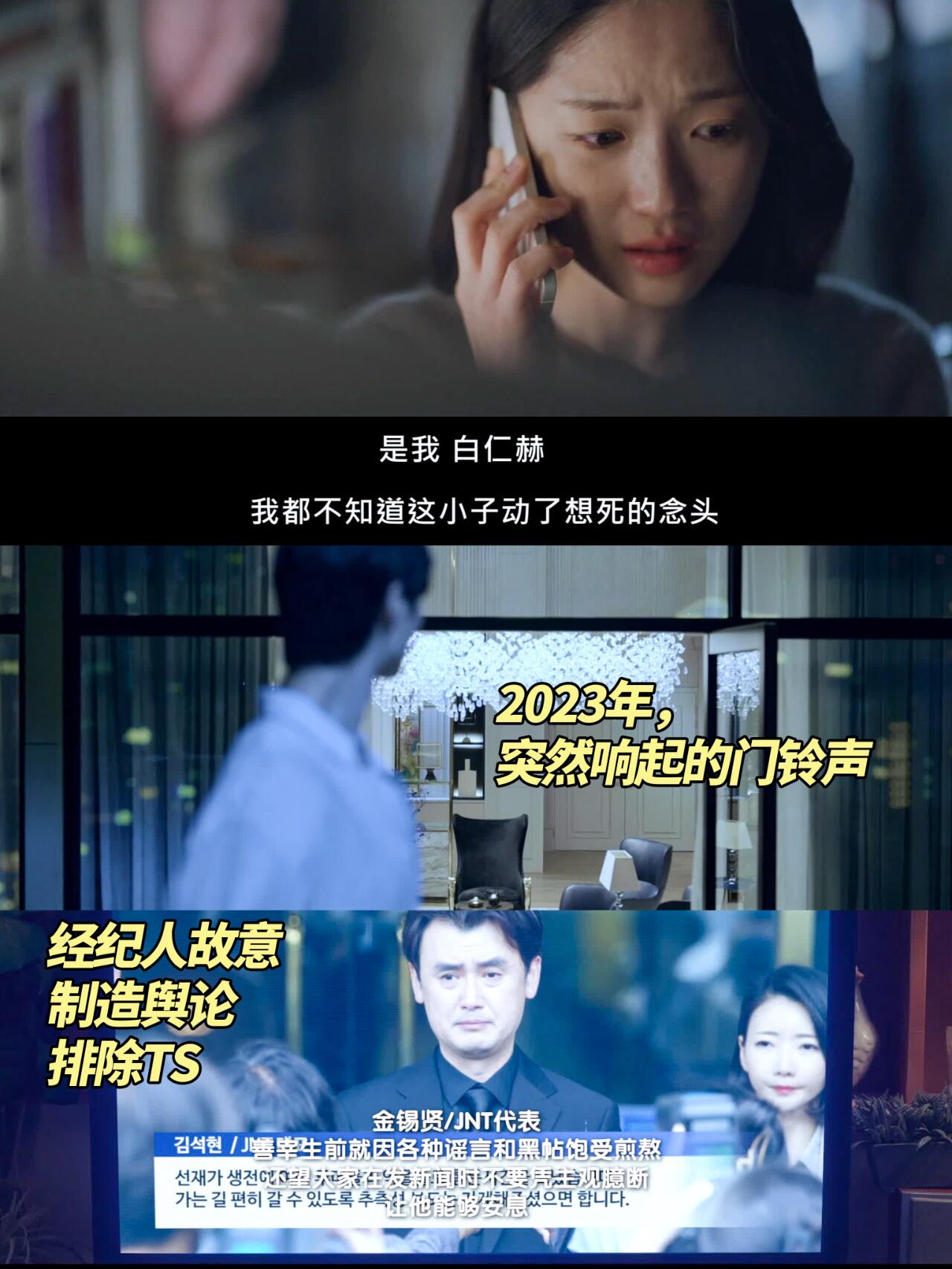 2.第四集男主演出前,进入后台时,三个队友看他的眼神都很微妙,能感受到队内关系是紧张的,同时男主好友电话女主,说自己没看出来善宰有自杀的倾向+男主酒店阳台响起的门铃声+经纪人故意制造舆论,引导观众觉得善宰是抑郁自杀,排除外界认为可能性。