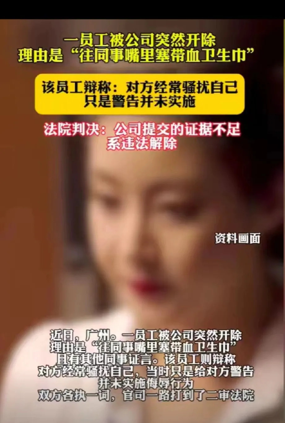 “伤害不大,侮辱极强!”广东广州,女子怒气冲冲跑到男同事跟前,从身后掏出一片带血的卫生巾,在男同事脸上疯狂涂抹,还往他嘴里塞。事后,公司以违反规定,影响恶劣为由,与女子解除劳动合同。女子不服,以自己怀孕为由闹上法庭,经过一审、二审,法院最终这样判。