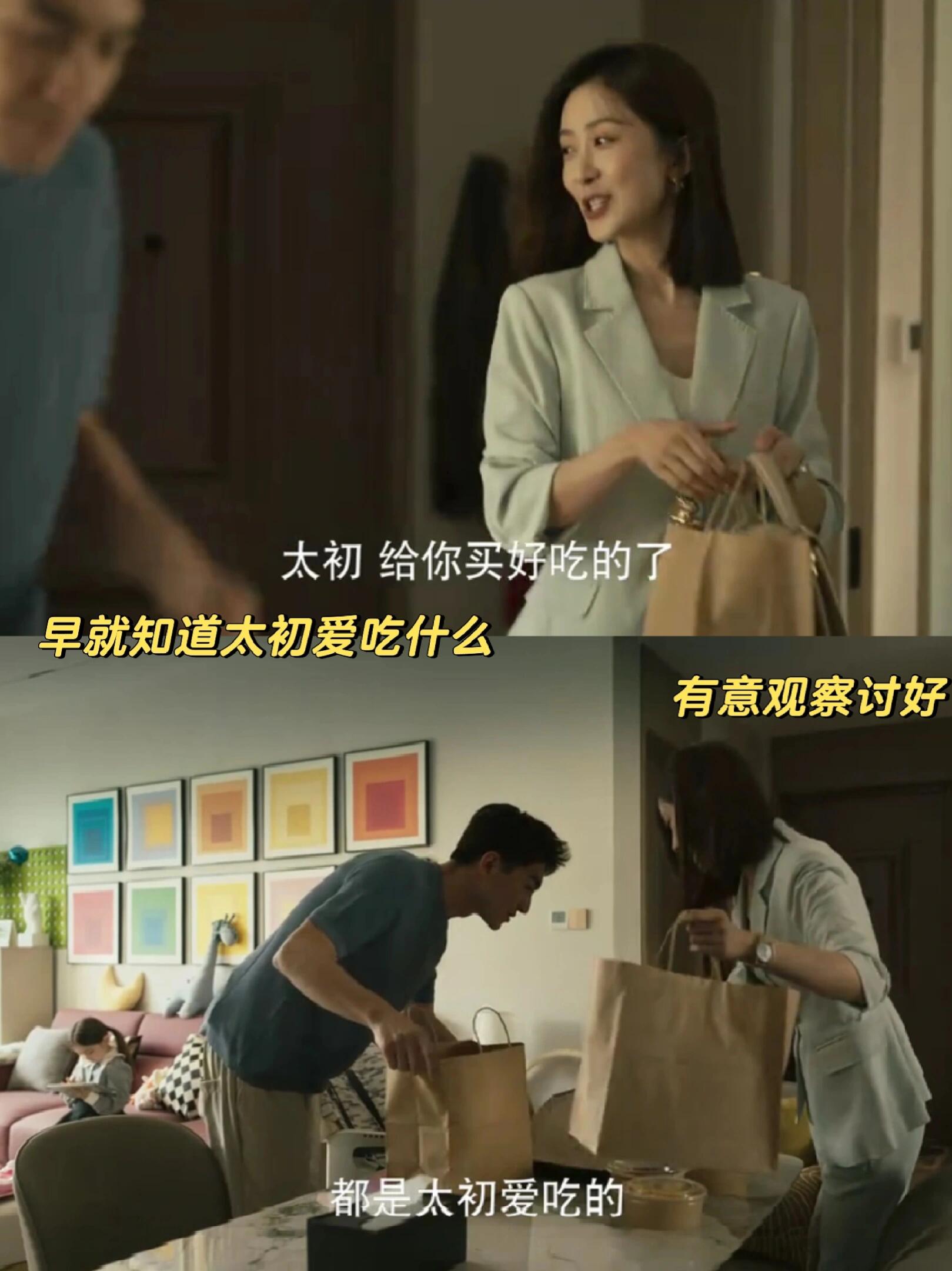 有意拉开距离:小雨满心欢喜地买了太初最爱的食物,协文让她把东西放下就赶她走。她的脸色是微微一变的,那种变化好像是以前她也这样做事,但他不会赶她走。她买食物就是认为会留下来一起吃的。(注意桌上食物的份量)