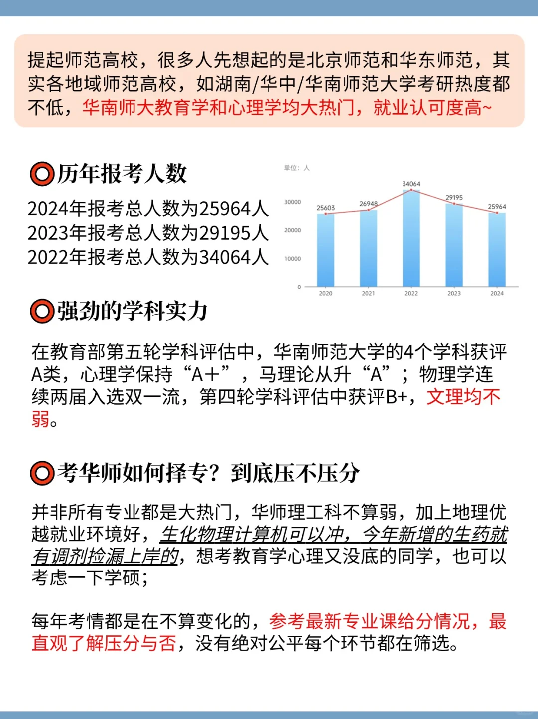 24考研华师报考人数超过2.5万人,近三年呈下降趋势,但学科教育专硕/应用心理依旧热门,学科英语报录比15:1左右~