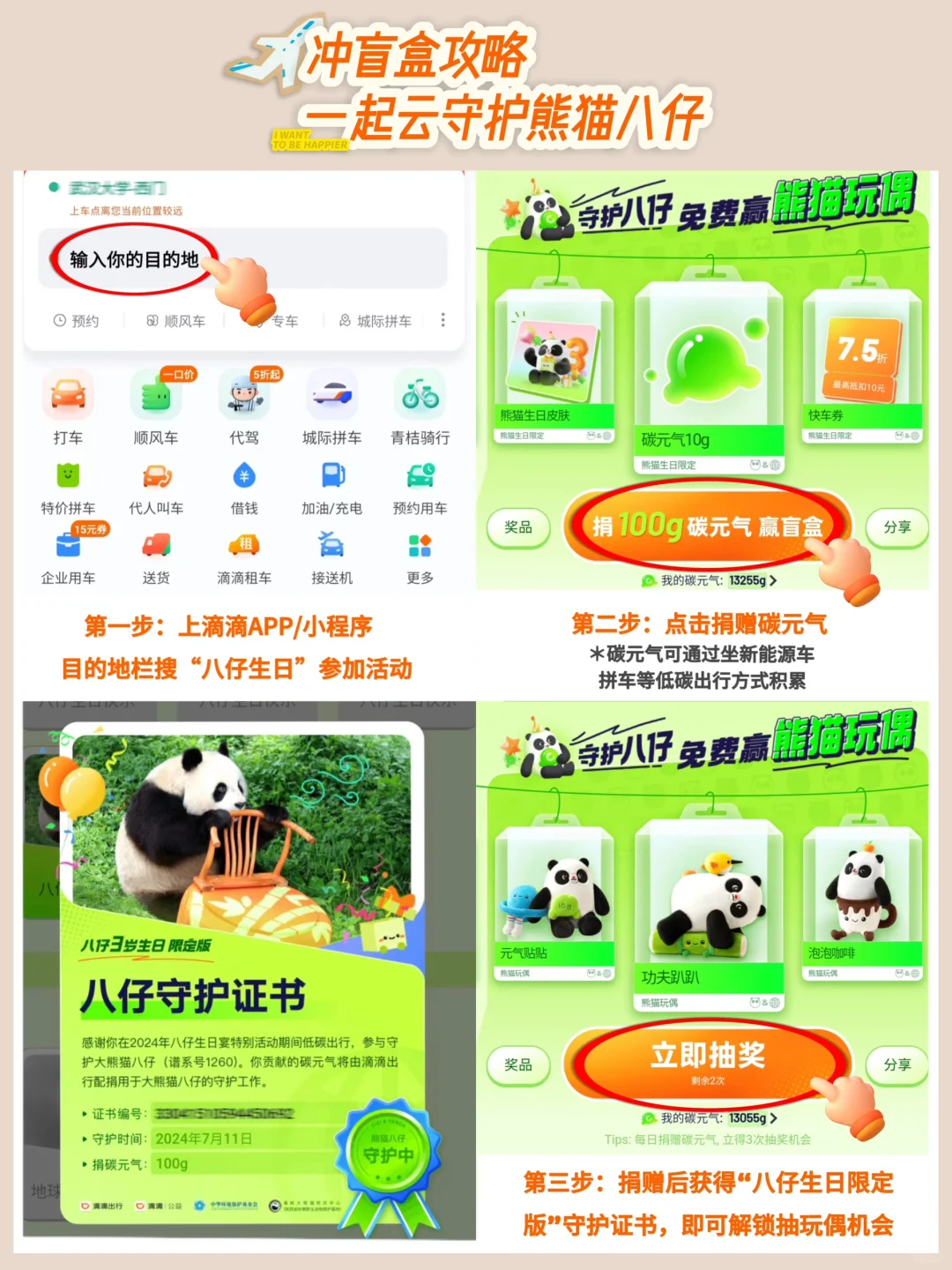 这些玩偶都是滴滴出行为了给他们守护的熊猫八仔庆生出的,八仔马上三岁啦([哇R]跟饼子一样哦!)7月21日之前,去滴滴app/小程序搜「八仔生日」,就能给八仔庆生~[向右R]戳戳手指捐点儿碳元气就能拿到八仔生日限定版守护证书,每天还都可以抽熊猫玩偶周边!